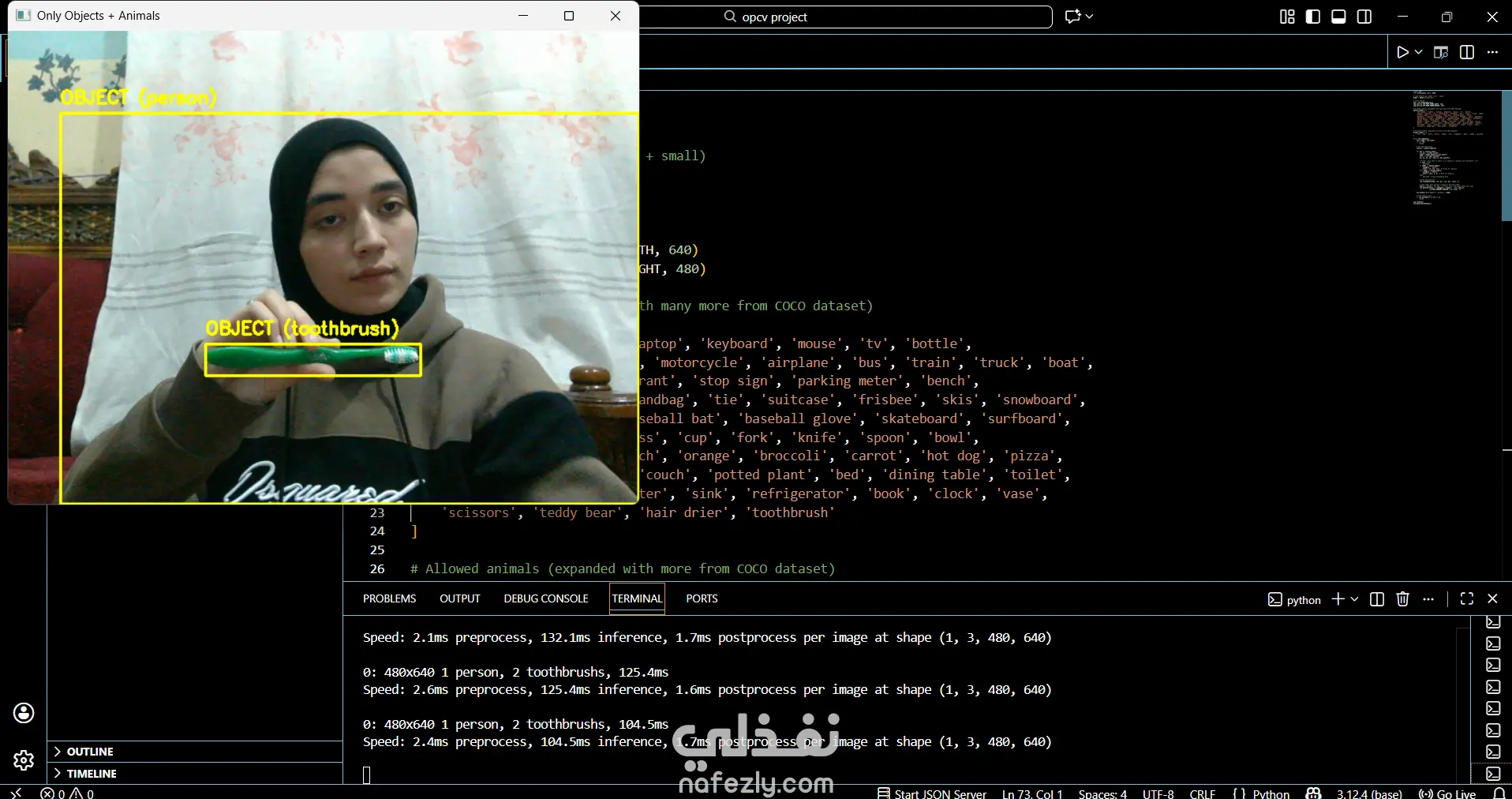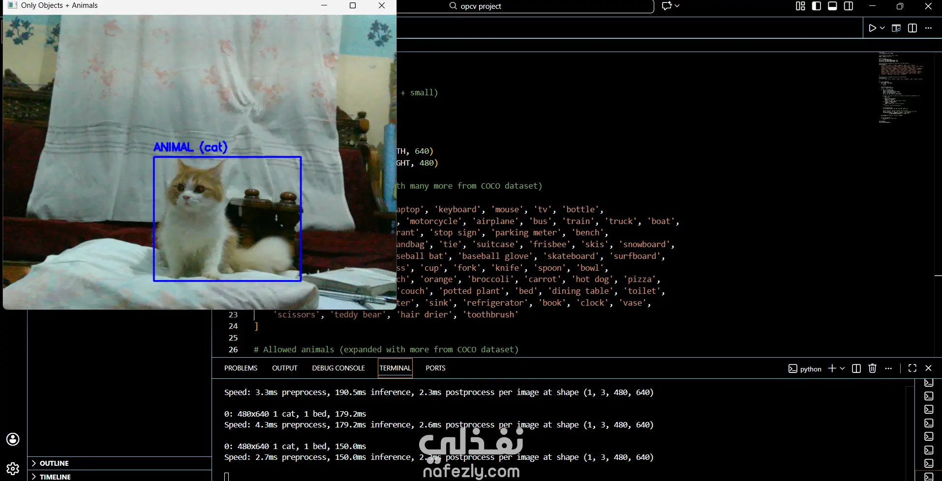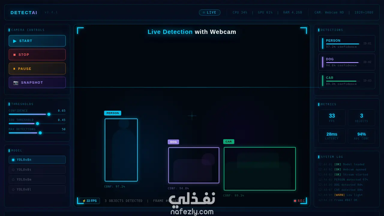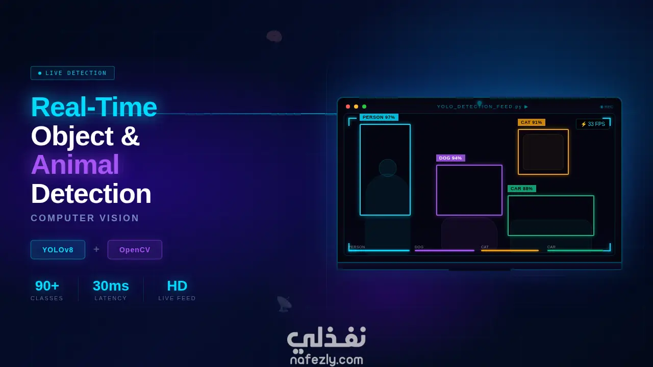 أقدّم نظام ذكاء اصطناعي متطور للكشف عن الكائنات والحيوانات في الوقت الحقيقي باستخدام YOLOv8 Nano و OpenCV عبر كاميرا الويب. يمكن للنظام التعرف على الأشياء الشائعة (مثل الأشخاص، السيارات، الأدوات) وكذلك الحيوانات مثل القطط، الكلاب، الخيول، الأفيال وغيرها، مع عرض Bounding Boxes وتسميات دقيقة على الفيديو. المشروع مناسب لتطبيقات المراقبة الأمنية، المشاريع التعليمية، وأنظمة مراقبة الحيوانات، كما يمكن تطويره ليعمل على واجهة ويب أو كـ API جاهز للتكامل مع أي تطبيق آخر.