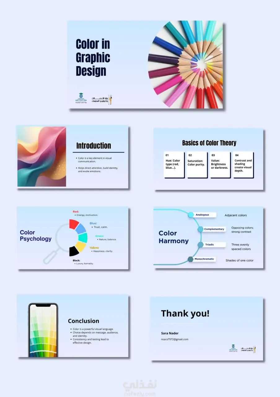 هل تبحث عن عرض تقديمي يجمع بين الدقة العلمية والإبداع البصري؟ في هذا العمل، قمت بتصميم عرض تقديمي متكامل يركز على "سيكولوجية ونظريات الألوان في التصميم الجرافيكي". لم يكن الهدف مجرد ترتيب نصوص، بل خلق تجربة بصرية تعليمية وجذابة تساعد الجمهور على استيعاب المعلومات المعقدة بسهولة. ما يميز هذا العرض التقديمي: التوازن البصري: استخدام شبكة تصميم تضمن تناسق العناصر في كل الشريحة. توظيف الألوان: اختيار لوحات ألوان تعكس هوية المحتوى وتوصل الرسالة المطلوبة (مثل استخدام تدرجات حيوية في مواضيع الإبداع). الإنفوجرافيك المخصص: تحويل البيانات والنصوص الجامدة إلى رسومات توضيحية سهلة الفهم. التسلسل المنطقي: تصميم تدفق بصري يوجه عين المشاهد نحو أهم النقاط في كل شريحة. الخدمات التي أقدمها في تصميم العروض: تصميم حقائب تدريبية. تصميم عروض تعريفية للشركات. تحويل المحتوى العلمي إلى تصاميم بصرية مبسطة وجذابة.