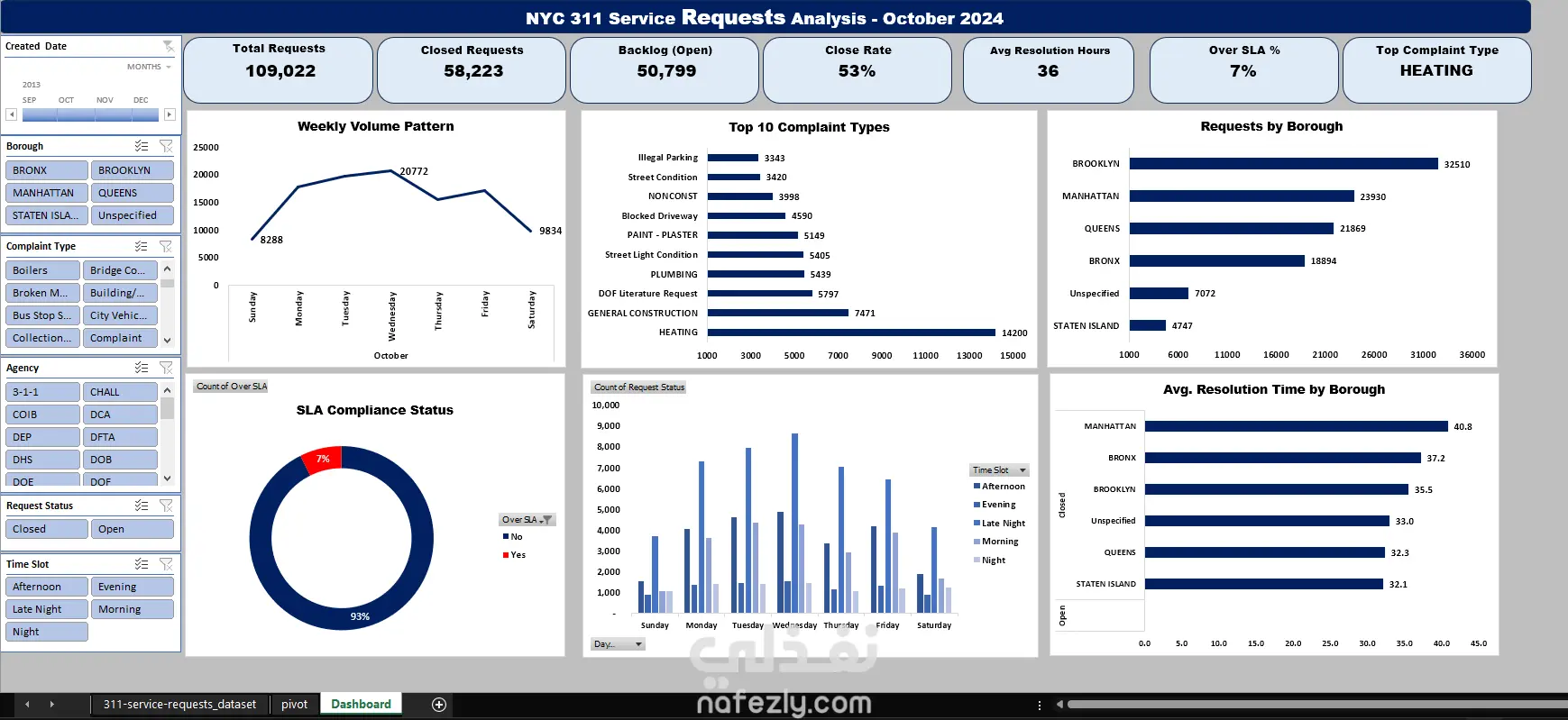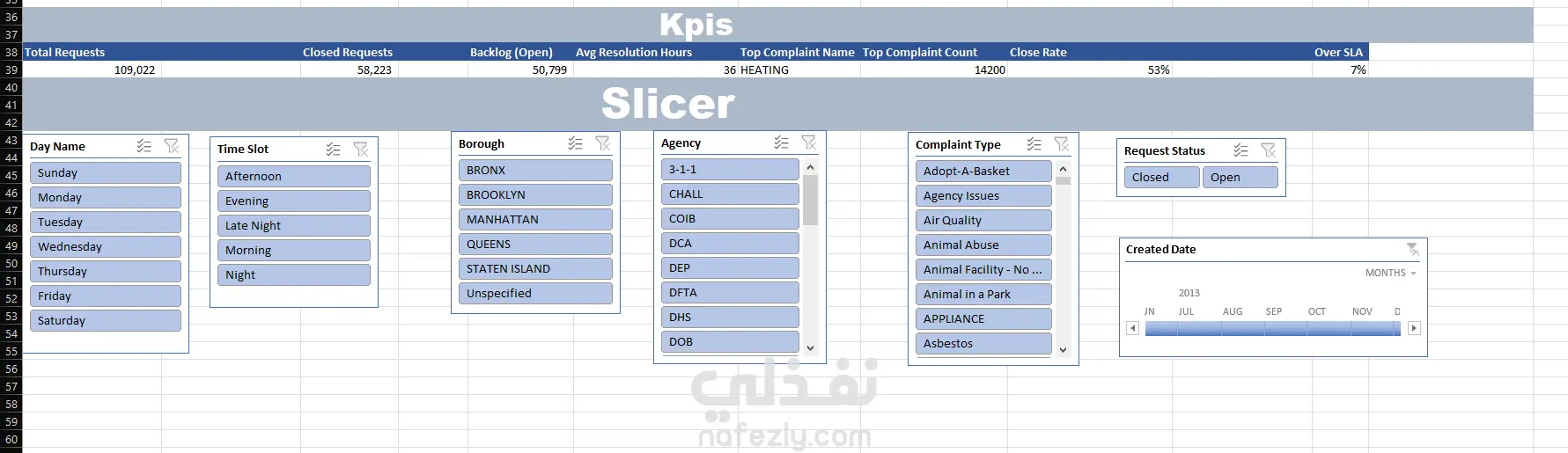 تحليل بيانات طلبات خدمة NYC 311 وتصميم لوحة تحكم تفاعلية (Excel Dashboard)