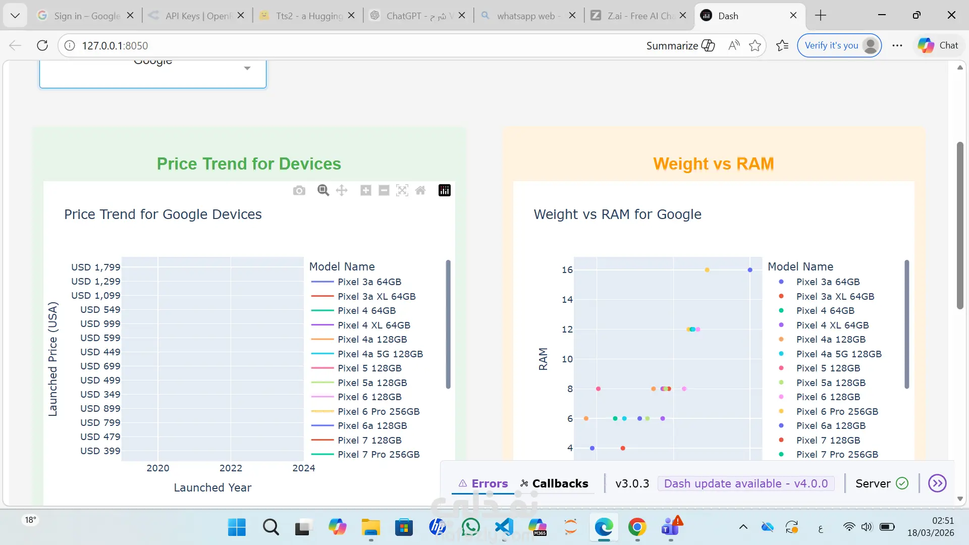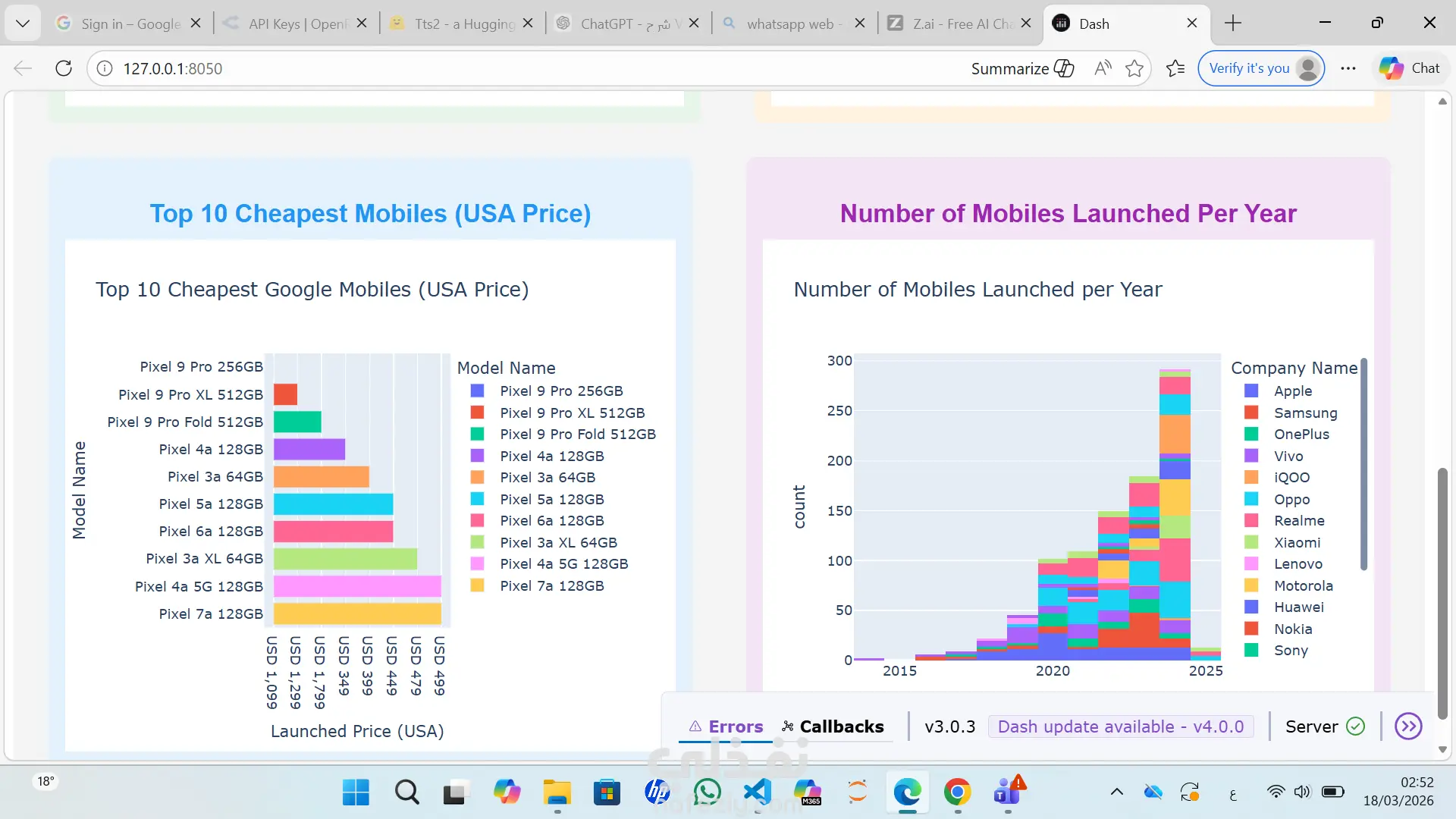 Data Analysis · Interactive Dashboard 📱 Mobile Dataset Dashboard داشبورد تفاعلي لتحليل بيانات الموبايلات عبر الشركات المختلفة. يتيح للمستخدم اختيار أي شركة ومشاهدة تطور أسعار أجهزتها عبر السنين، ومقارنة الوزن بالـ RAM، وأرخص 10 موبايلات في السوق الأمريكي، بالإضافة إلى عدد الأجهزة المُطلقة لكل سنة. Python Dash Plotly Pandas Data Visualization EDA الإطار Plotly Dash الرسوم البيانية Line · Scatter · Bar · Histogram التفاعل Dropdown Filter