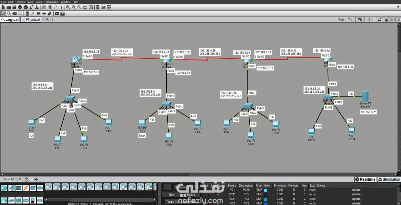 تصميم ومحاكاة شبكة كمبيوتر متكاملة لمؤسسة (Cisco Packet Tracer)