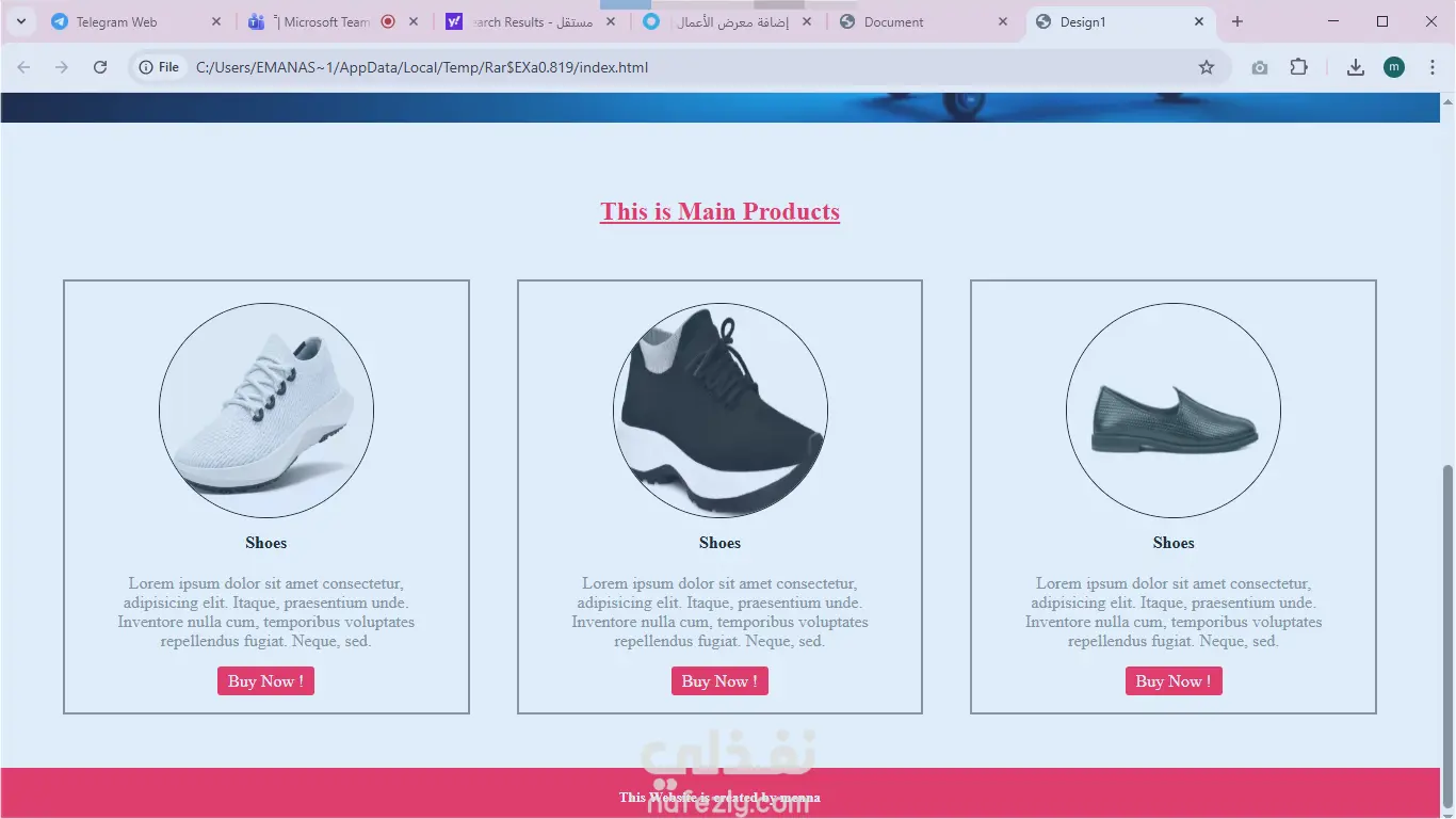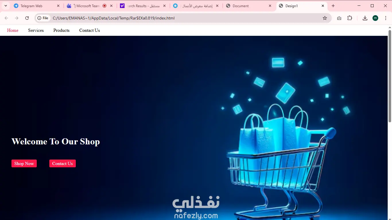 صميم عصري وجذاب لعرض المنتجات. صفحة رئيسية تحتوي على بانر (Hero Section) وعروض مميزة. عرض المنتجات في شكل كروت (Product Cards) تشمل صورة، اسم المنتج، السعر، وزر الشراء. شريط تنقل (Navigation Bar) منظم وسهل الاستخدام. فوتر (Footer) يحتوي على معلومات التواصل وروابط مهمة.