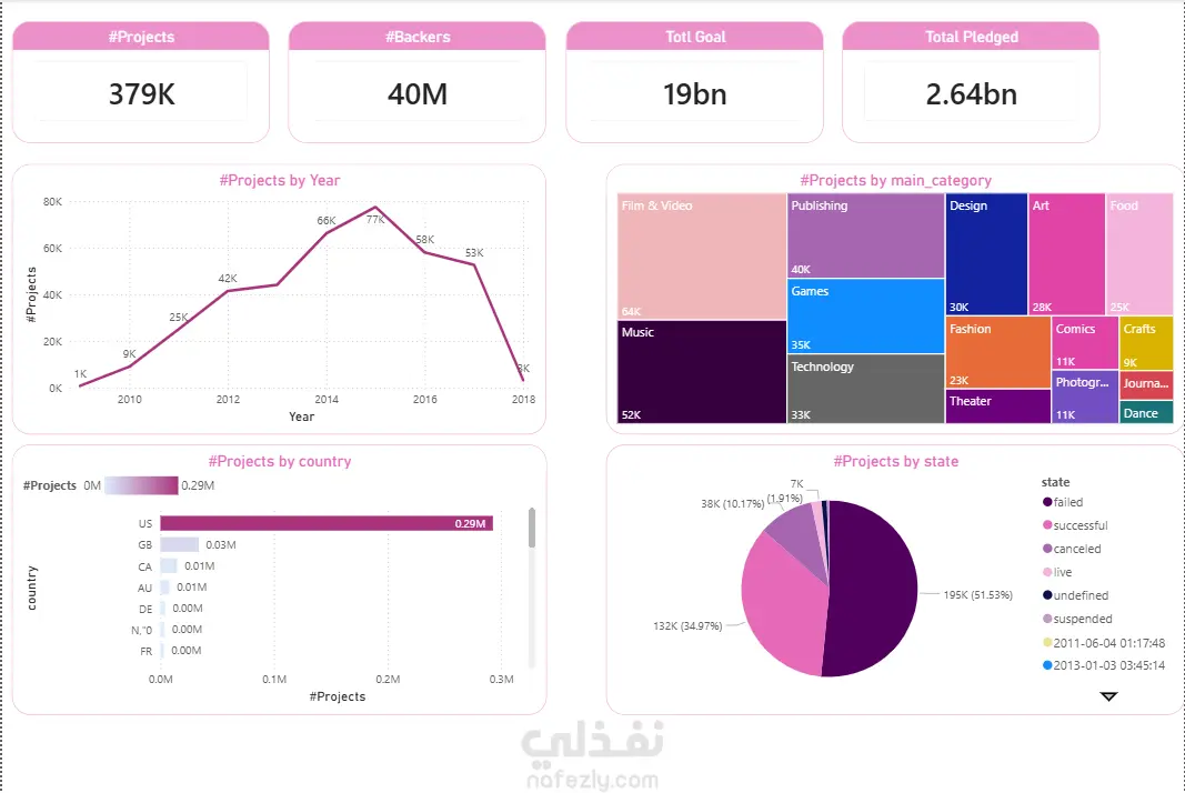 قمت بتصميم لوحة بيانات (Dashboard) متكاملة لتحليل أداء مشاريع التمويل الجماعي، شمل العمل: