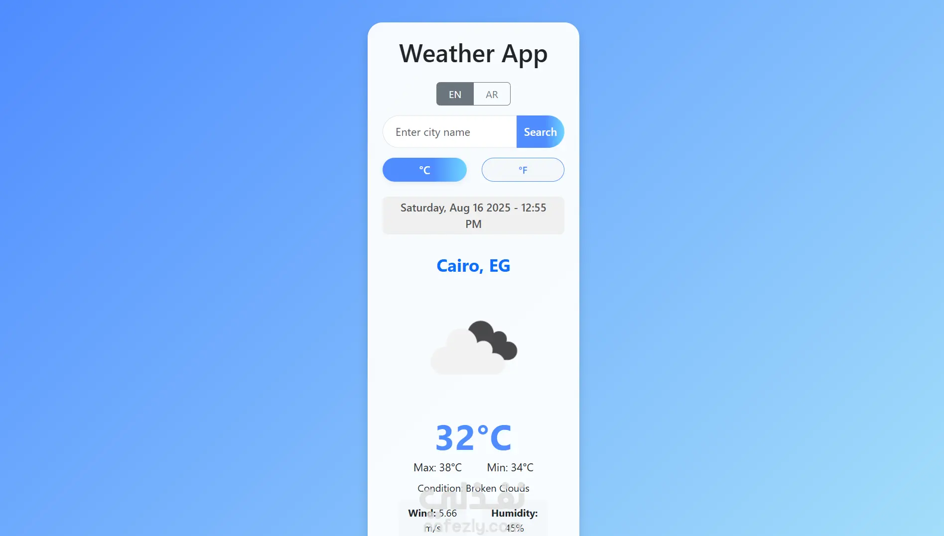 تطبيق لعرض حالة الطقس يعتمد على Next.js وواجهات برمجة التطبيقات (REST API) لجلب البيانات بشكل آمن من جهة الخادم. يتميز بتصميم متجاوب، ودعم كامل لإمكانية الوصول، مع اختبارات وحدات باستخدام Jest وReact Testing Library لضمان الجودة والاستقرار.