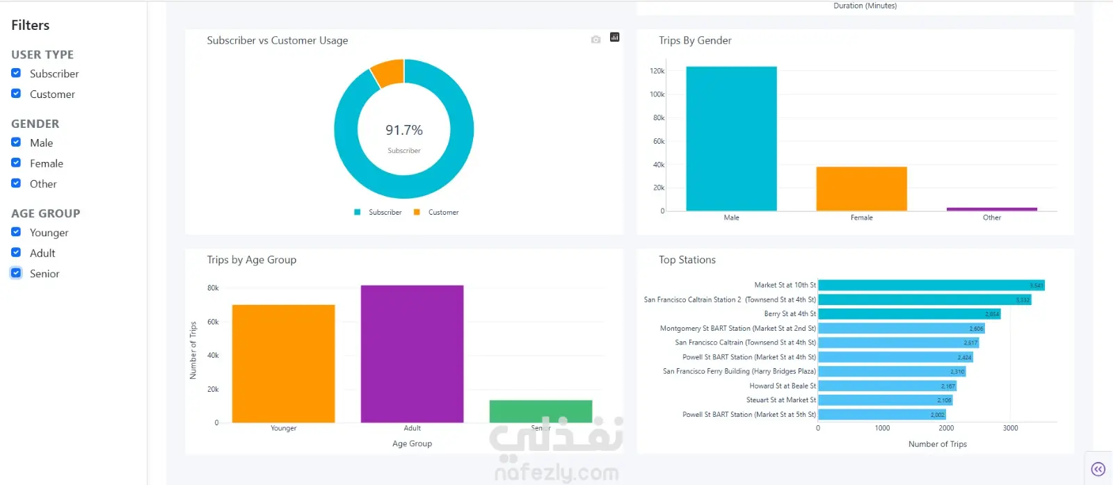 في هذا المشروع قمنا بتنفيذ تحليل بيانات متكامل لبيانات رحلات Ford GoBike بهدف استخراج رؤى تساعد على فهم سلوك المستخدمين وأنماط التنقل داخل المدن. بدأ العمل بمعالجة وتنظيف البيانات الخام، ثم إجراء تحليل استكشافي للبيانات، وأخيرًا بناء لوحة تحكم تفاعلية (Interactive Dashboard) تساعد على عرض المؤشرات المهمة بشكل بصري يدعم اتخاذ القرار. تم تصميم لوحة التحكم بحيث تتيح استكشاف البيانات بشكل ديناميكي من خلال الفلاتر والرسوم التفاعلية، مما يسمح بفهم أفضل لأنماط الاستخدام وأوقات الذروة والمحطات الأكثر نشاطًا. التقنيات المستخدمة: Python Pandas NumPy Dash Plotly أهم مميزات المشروع: بناء Dashboard تفاعلي لتحليل أداء الرحلات تحليل سلوك المستخدمين (Subscriber vs Customer) تحليل الرحلات حسب الجنس والفئة العمرية دراسة مدة الرحلات وتحديد أوقات الذروة تحديد المحطات الأكثر نشاطًا والأعلى طلبًا تصميم مؤشرات أداء رئيسية (KPIs) مثل: إجمالي عدد الرحلات متوسط مدة الرحلة عدد المستخدمين النشطين أكثر محطة استخدامًا النتائج الرئيسية: المستخدمون المشتركون (Subscribers) يمثلون النسبة الأكبر من الرحلات أغلب الرحلات قصيرة المدة، مما يعكس استخدام الخدمة في التنقل اليومي داخل المدينة بعض المحطات تعمل كمراكز رئيسية للحركة والتنقل الفئات العمرية الشابة والمتوسطة هي الأكثر استخدامًا للمنصة هذا المشروع يوضح القدرة على تحليل البيانات، استخراج الرؤى، وبناء أدوات تفاعلية لعرض النتائج بطريقة تساعد في اتخاذ القرارات المبنية على البيانات