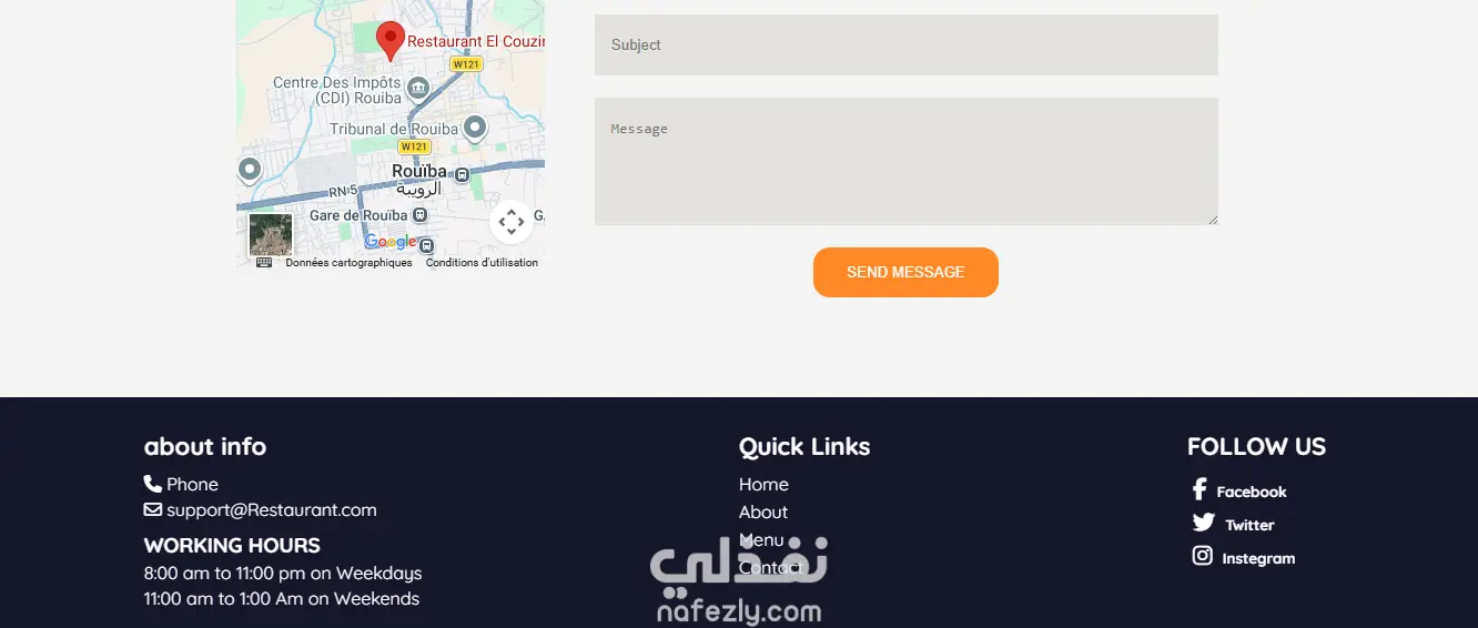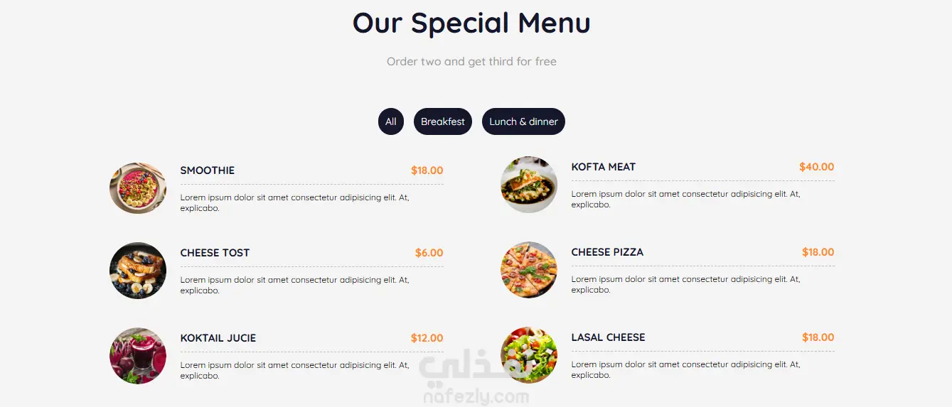 صفحة هبوط ب استخدام html و css و javaScript لعرض خدمات مطعم. - تصميم عصري و بسيط . - تبديل انواع الاكل بإستخدام java script - تصميم متجاوب يعمل بكفاءة على جميع الشاشات بفضل لغة Css. - أكواد نظيفة وسهلة التعديل.