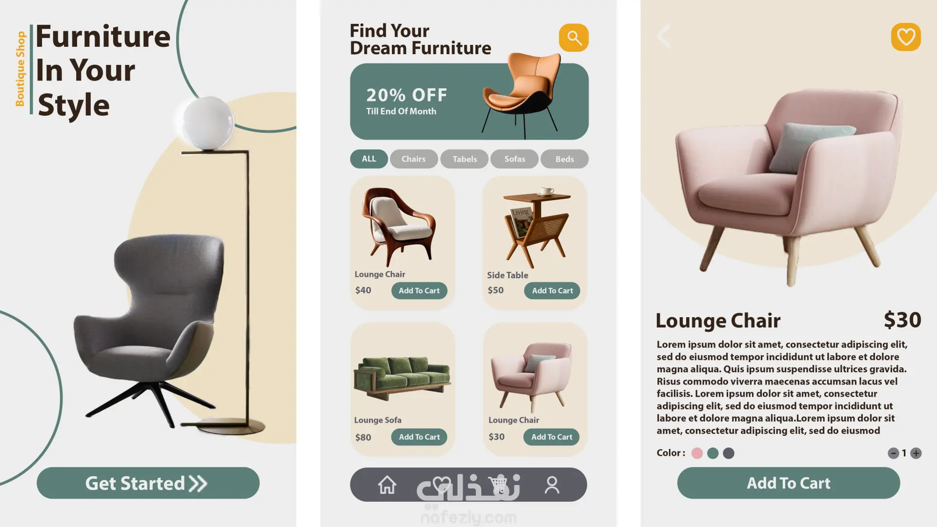 تصميم واجهه مستخدم ابليكشن لمعرض اثاث منزلي اول شاشه وهي شاشه الترحيب والشاشة الثانية وهي عرض الانواع المتوفرة وتفاصل لكل منتج والشاشة الثالثة لعرض نتج منفصل وقابليه اضافه للعربة والتحكم في المميزات المتاحة للمنتج طريقه تنفيذه كامل ب استخدام فوتوشوب