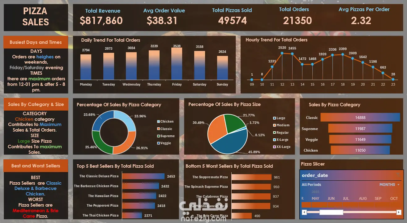 قمت بتصميم لوحة بيانات تفاعلية متقدمة لتحليل مبيعات البيتزا، بهدف مساعدة أصحاب القرار على فهم الأداء البيعي، واكتشاف الأنماط المهمة التي تؤثر على الطلبات والإيرادات. خطوات العمل: تحليل البيانات من المصدر باستخدام SQL لاستخراج مؤشرات الأداء والمقاييس الأساسية. تحميل النتائج وتنظيف البيانات باستخدام Power BI. تصميم لوحة تفاعلية غنية بالمؤشرات والرسوم البيانية. مكونات ومميزات اللوحة: مؤشرات الأداء الرئيسية (KPIs): Total Revenue: $817,860 Avg Order Value: $38.31 Total Pizzas Sold: 49,574 Total Orders: 21,350 Avg Pizzas per Order: 2.32 تحليلات زمنية: حسب اليوم (Daily Trend): أعلى الطلبات يوم الجمعة. حسب الساعة (Hourly Trend): ذروة الطلب بين 12-1 ظهرًا و5-8 مساءً. تحليلات حسب الفئة والحجم: فئة Chicken تساهم بأعلى الإيرادات. الحجم Large يمثل أعلى نسبة مبيعات (45.89%). أفضل وأسوأ المنتجات مبيعًا: الأفضل: Classic Deluxe, Barbecue Chicken الأسوأ: Mediterranean, Brie Carre Slicer زمني للتصفية حسب الأشهر (من مايو إلى أكتوبر 2015). الاستعلامات المستخدمة (SQL Highlights): قمت باستخدام استعلامات SQL لتحليل البيانات من قاعدة البيانات pizza_sales، ومن أهم الاستعلامات: Total Revenue: SELECT SUM(total_price) AS Total_Revenue FROM pizza_sales Avg Order Value: SELECT ROUND(SUM(total_price) / COUNT(DISTINCT order_id), 2) AS AVG_Order_Value FROM pizza_sales Daily Orders Trend: SELECT DATENAME(DW, order_date) AS Order_Day, COUNT(DISTINCT order_id) AS Total_Orders FROM pizza_sales GROUP BY DATENAME(DW, order_date) Top 5 Best Sellers: SELECT TOP(5) pizza_name, SUM(quantity) AS Total_Pizza_Sold FROM pizza_sales GROUP BY pizza_name ORDER BY SUM(quantity) DESC وغيرها من الاستعلامات المتعلقة بالفئات، الأحجام، وأسوأ المنتجات مبيعًا. ️ الأدوات المستخدمة: SQL Server Power BI Desktop DAX رسوم بيانية مخصصة (Pie, Bar, Line) Slicers وFilters تفاعلية الهدف من المشروع: تمكين أصحاب القرار من: معرفة سلوك العملاء حسب الوقت واليوم. تحديد المنتجات الرائجة والراكدة. تحليل الأداء البيعي بناءً على الحجم والفئة