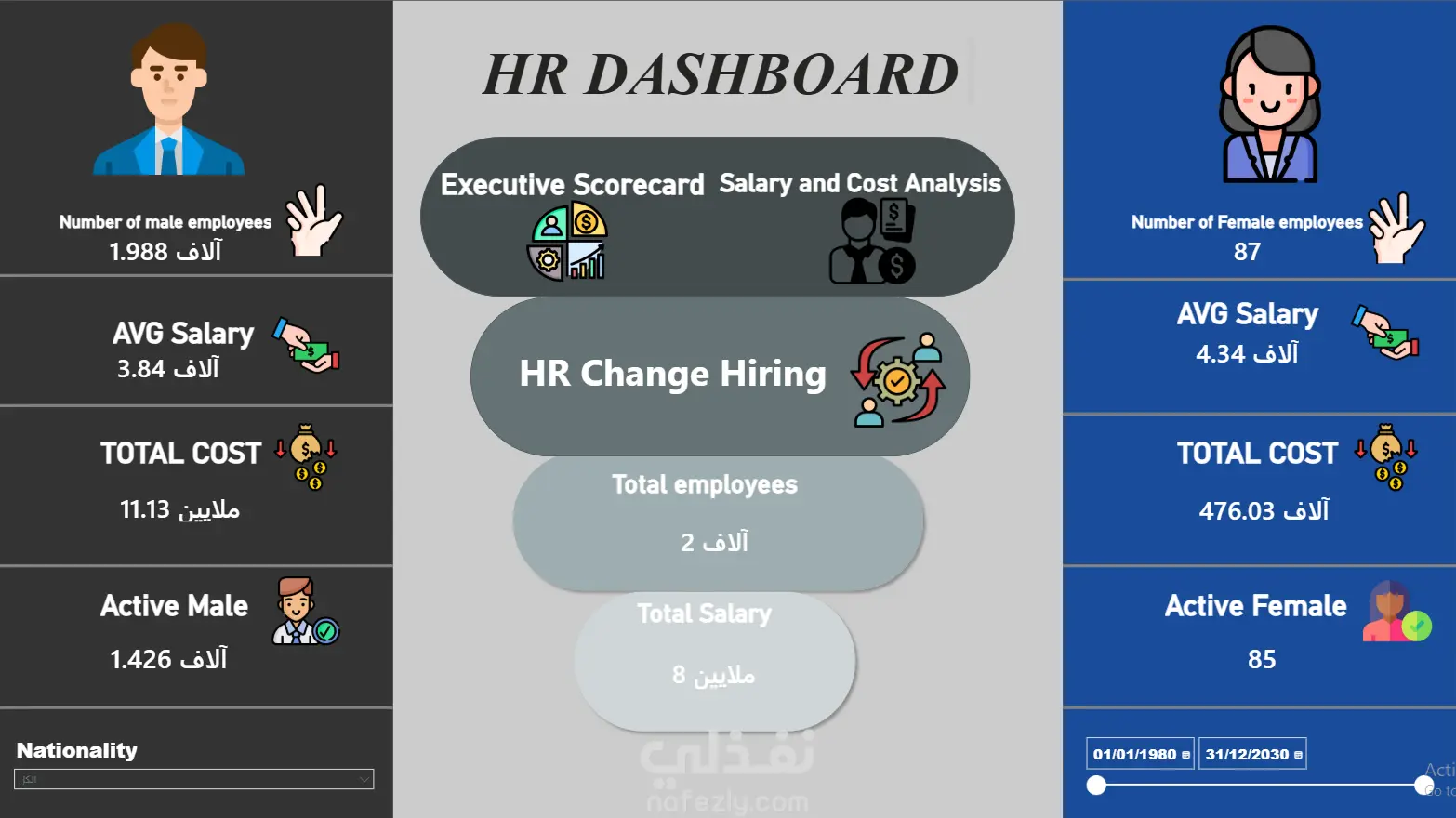 ملخص شامل لإحصائيات الموظفين (عدد، رواتب، تكاليف، توزيع حسب الجنس والجنسية).