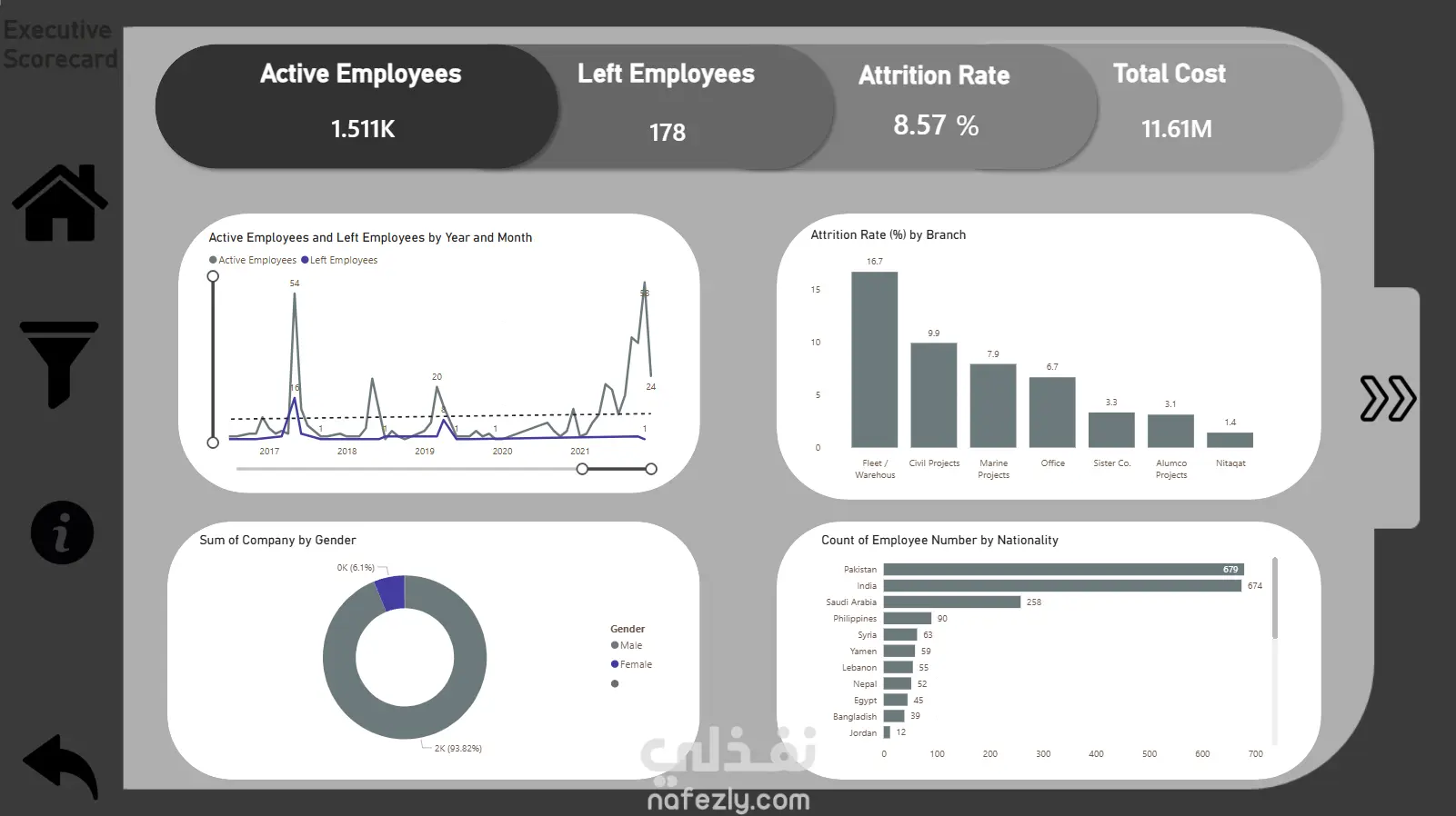 تحليل معدل الدوران (Attrition Rate) عبر الفروع المختلفة مع اتجاهات زمنية.