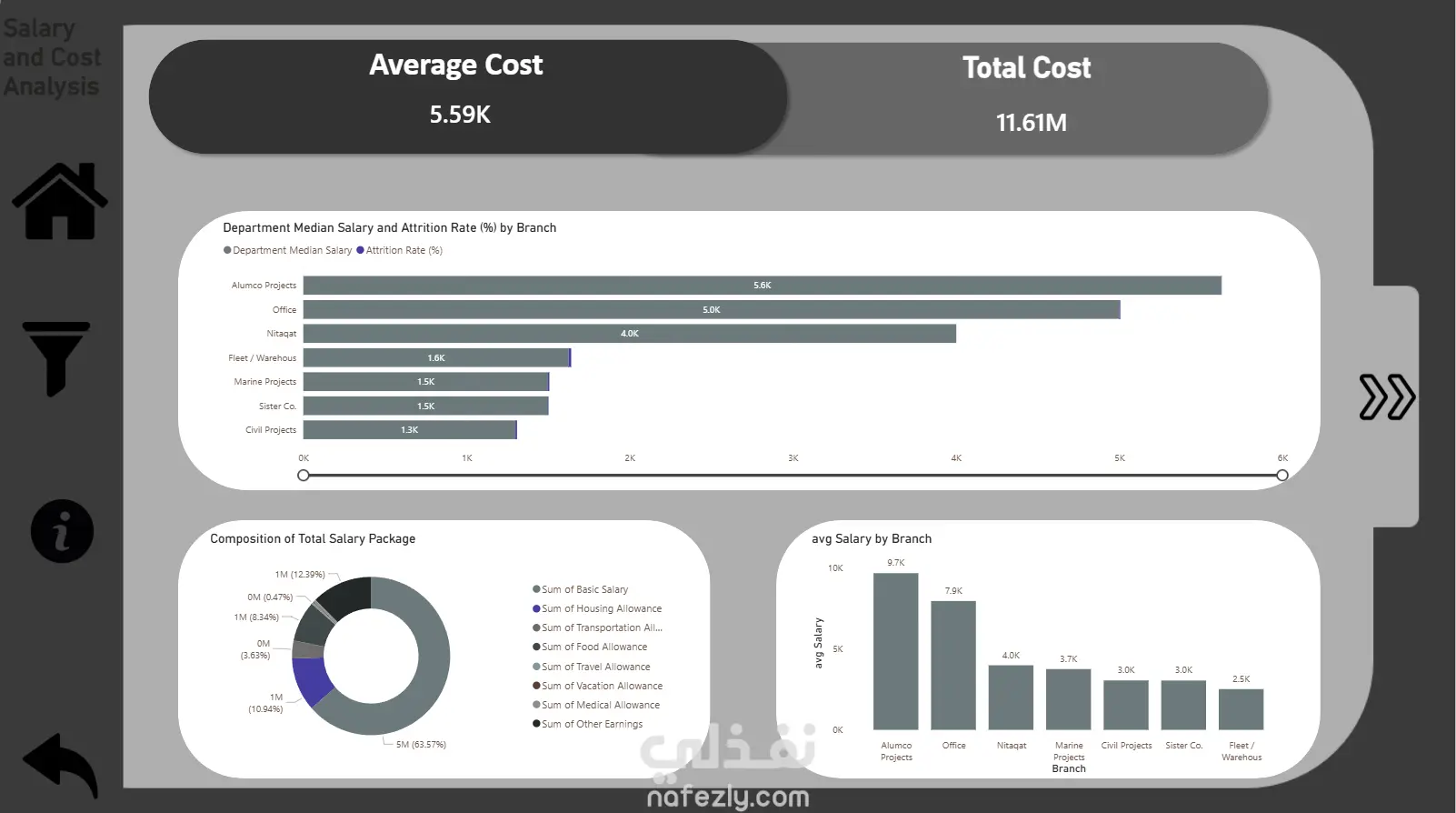 تحليل الرواتب والتكاليف مع تفصيل مكونات حزم الرواتب (أساسي، بدل سكن، مواصلات، إلخ).