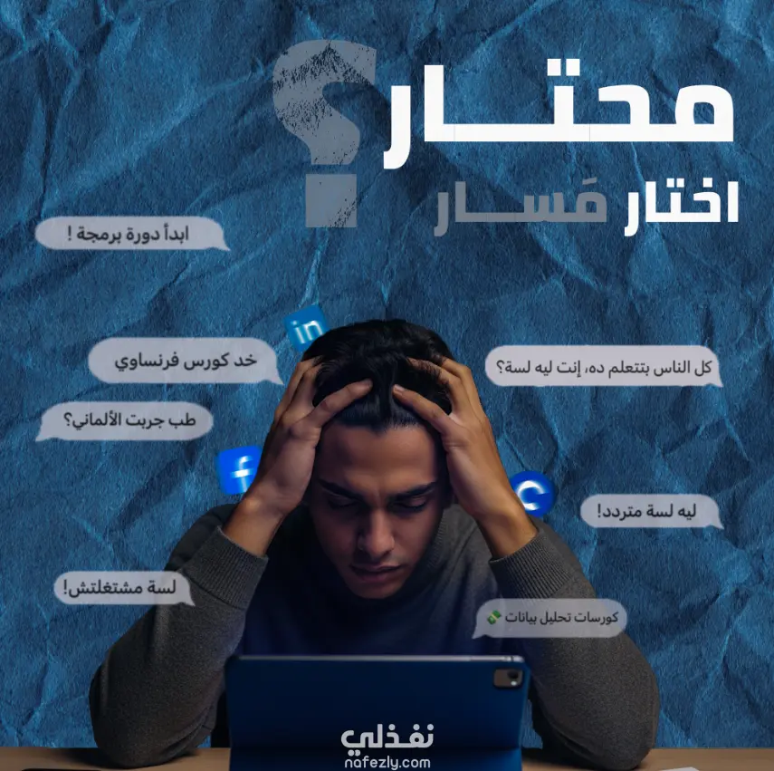 قمت بتصميم إعلان إبداعي يعبّر عن حالة التشتت والحيرة التي يمر بها الكثير من الأشخاص عند اختيار مسارهم التعليمي أو المهني، وذلك من خلال دمج عناصر بصرية تعكس الضغط والتفكير الزائد.