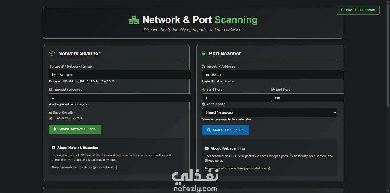 موقع ويب أداة تقنية يتيح للمستخدمين فحص الشبكات والـ Ports وتشغيل أدوات مكتوبة بـ Python مباشرة من خلال واجهة سهلة الاستخدام.