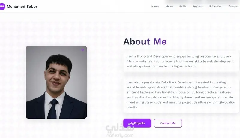 يتضمن الموقع أقسامًا مثل "نبذة عني" و"المشاريع" و"التواصل"، مما يوفر نظرة شاملة على أعمالي وخلفيتي المهنية. يتميز التصميم بالبساطة والوضوح وسهولة الاستخدام على جميع الأجهزة.