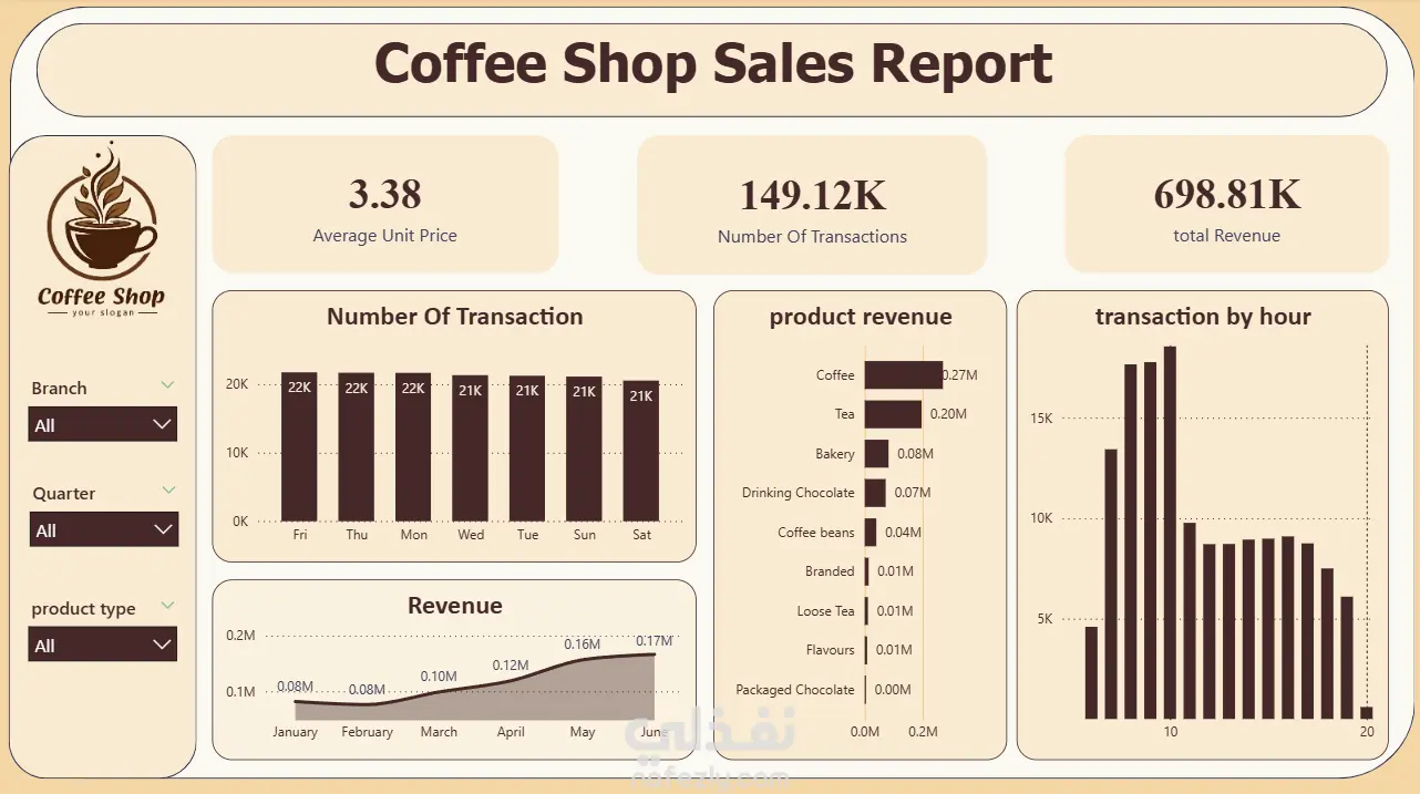 تحليل مبيعات كوفي شوب باستخدام Microsoft Power BI بعد تنفيذ تنظيف وتجهيز البيانات باستخدام Microsoft Excel. بدأ العمل بمرحلة تنظيف البيانات (Data Cleaning) في Excel من خلال إزالة القيم المكررة، معالجة القيم المفقودة، توحيد تنسيق التواريخ، وتصحيح الأخطاء في أسماء المنتجات والفروع لضمان جودة البيانات قبل التحليل. بعد تجهيز البيانات تم استيرادها إلى Power BI وبناء Dashboard تفاعلية لعرض مؤشرات الأداء الرئيسية مثل إجمالي المبيعات، عدد الطلبات، ومتوسط قيمة الطلب. تم تحليل المبيعات حسب الفروع، المنتجات الأكثر مبيعًا، وأوقات الذروة خلال اليوم والأيام الأكثر نشاطًا خلال الأسبوع. كما تم استخدام الرسوم البيانية والفلاتر التفاعلية لتسهيل استكشاف البيانات واتخاذ قرارات مبنية على البيانات. المشروع يوضح القدرة على تحويل البيانات الخام إلى لوحة معلومات تحليلية واضحة تساعد أصحاب الأعمال على فهم أداء المبيعات وتحديد فرص تحسين الأرباح.