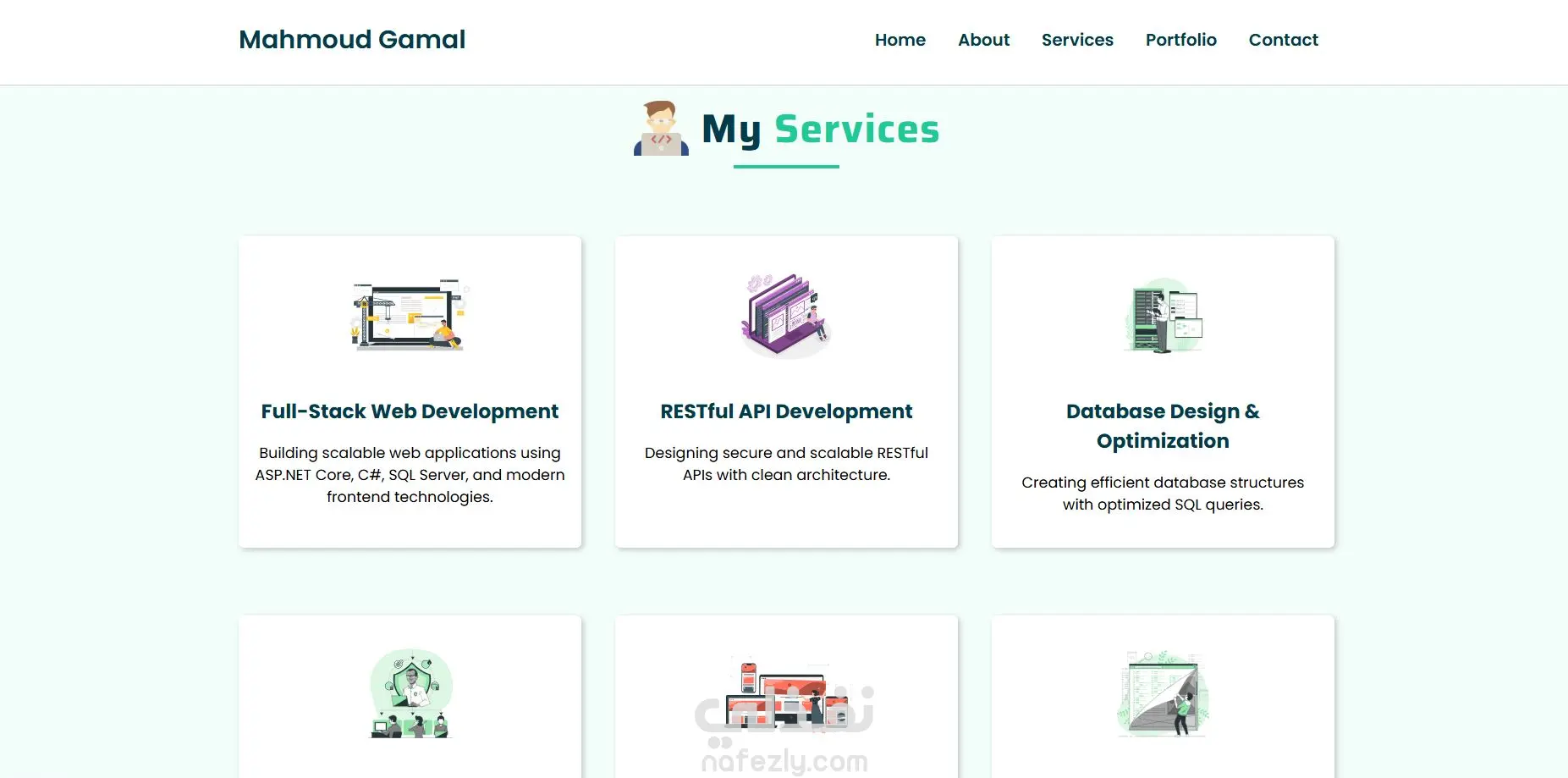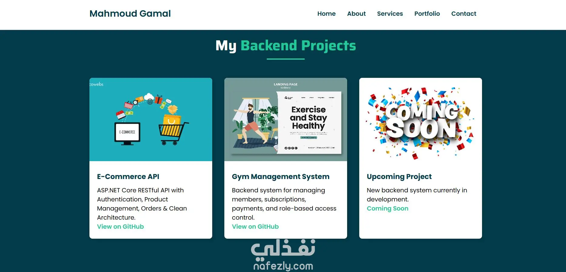 قمت بتصميم وتطوير موقع Portfolio شخصي لعرض مهاراتي وخدماتي ومشاريعي في مجال Full-Stack Web Development. الموقع يحتوي على: صفحة تعريف (About) توضح خبرتي في ASP.NET Core و Web Development قسم الخدمات (Services) لعرض الخدمات مثل API Development و Authentication عرض المشاريع (Portfolio) مثل E-Commerce API و Gym Management System نموذج تواصل (Contact Form) لاستقبال الرسائل تصميم Responsive يعمل على جميع الأجهزة التقنيات المستخدمة: HTML, CSS, JavaScript أساسيات Frontend Structure وتنظيم UI ربط المشاريع الخارجية (GitHub Integration) الهدف من المشروع: بناء هوية احترافية أونلاين لعرض الأعمال وزيادة فرص الحصول على Freelance Clients