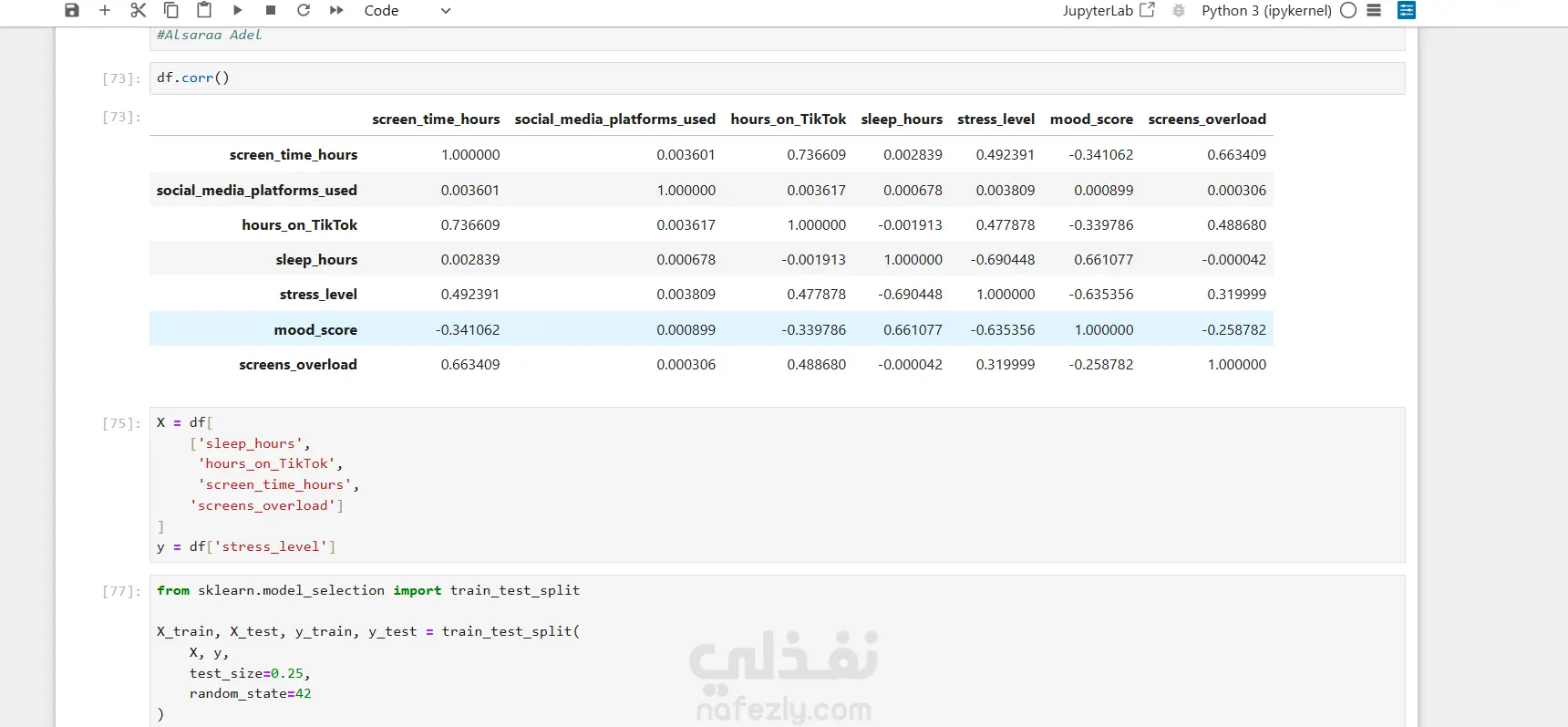 قمت بتنفيذ مشروع تحليل بيانات يهدف إلى دراسة العلاقة بين عدد ساعات استخدام الشاشات (Screen Time) وبعض المؤشرات المرتبطة بالصحة النفسية. شمل المشروع مراحل تنظيف البيانات ومعالجتها باستخدام Python ومكتبة Pandas؛ ثم تحليل البيانات واستخراج الأنماط والعلاقات بينها. كما تم إنشاء مجموعة من الرسوم البيانية باستخدام Matplotlib وSeaborn لتوضيح النتائج بشكل بصري. وفي المرحلة الأخيرة تم تطبيق نموذج Machine Learning باستخدام Random Forest لتحليل البيانات ومحاولة التنبؤ ببعض المؤشرات اعتمادًا على المتغيرات المتاحة. ساعد هذا التحليل في تقديم رؤى واضحة حول تأثير وقت استخدام الشاشات على بعض جوانب الصحة النفسية.
