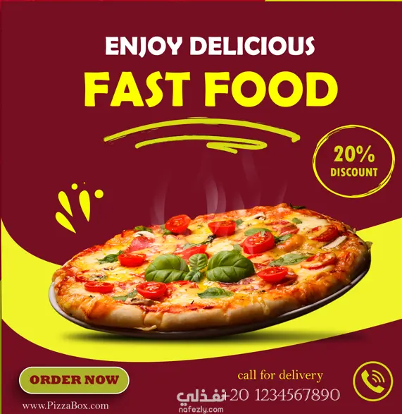 تم تصميم هذا البوست للوجبات السريعة (بيتزا) بهدف جذب الانتباه الفوري وزيادة المبيعات. استخدمت لوحة ألوان حيوية ودافئة (الأحمر والأصفر الليموني) لإثارة الشهية والشعور بالإثارة. يبرز التصميم العرض الخاص (خصم 20%) بشكل بارز، مع توزيع متوازن لعناصر الاتصال المباشر مثل رقم الهاتف وزر "اطلب الآن" لتعزيز تجربة المستخدم وتشجيعه على اتخاذ إجراء سريع. التصميم متماسك بصرياً ومثالي لمنصات السوشيال ميديا.