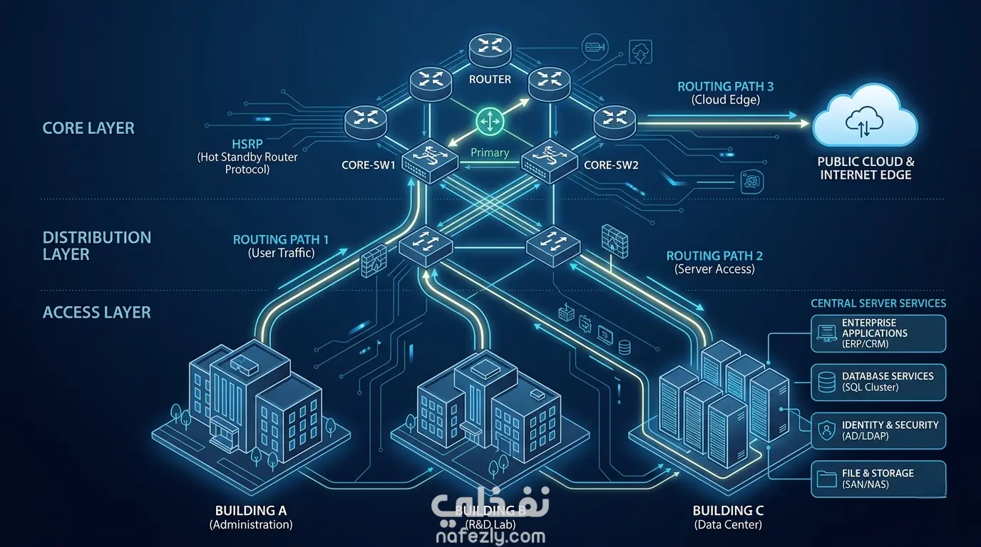 يسعدني عرض هذا المشروع ضمن معرض أعمالي على موقع مستقل، حيث قمت بتصميم وتنفيذ شبكة متكاملة متعددة المباني (Multi-Building Network) مع بنية احترافية تعتمد على أفضل ممارسات تصميم الشبكات.