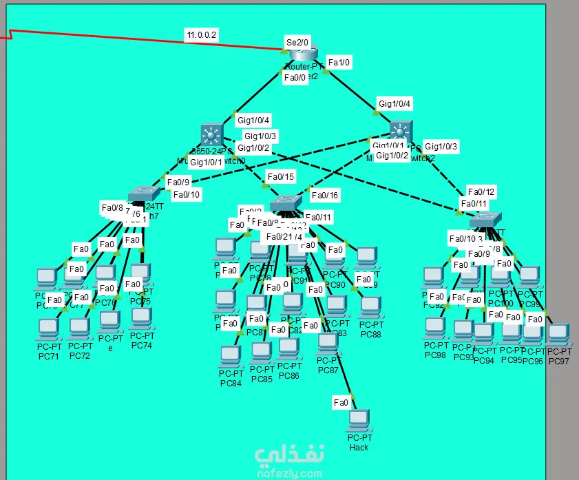 يشمل المشروع ربط 3 مباني مختلفة باستخدام بنية طبقية (Core – Distribution – Access)، مع توفير خدمات مركزية مثل DHCP، DNS، Web، Email، وFTP من خلال سيرفر مركزي، بالإضافة إلى تطبيق آليات الأمان والتكرار لضمان استقرار الشبكة وكفاءتها.