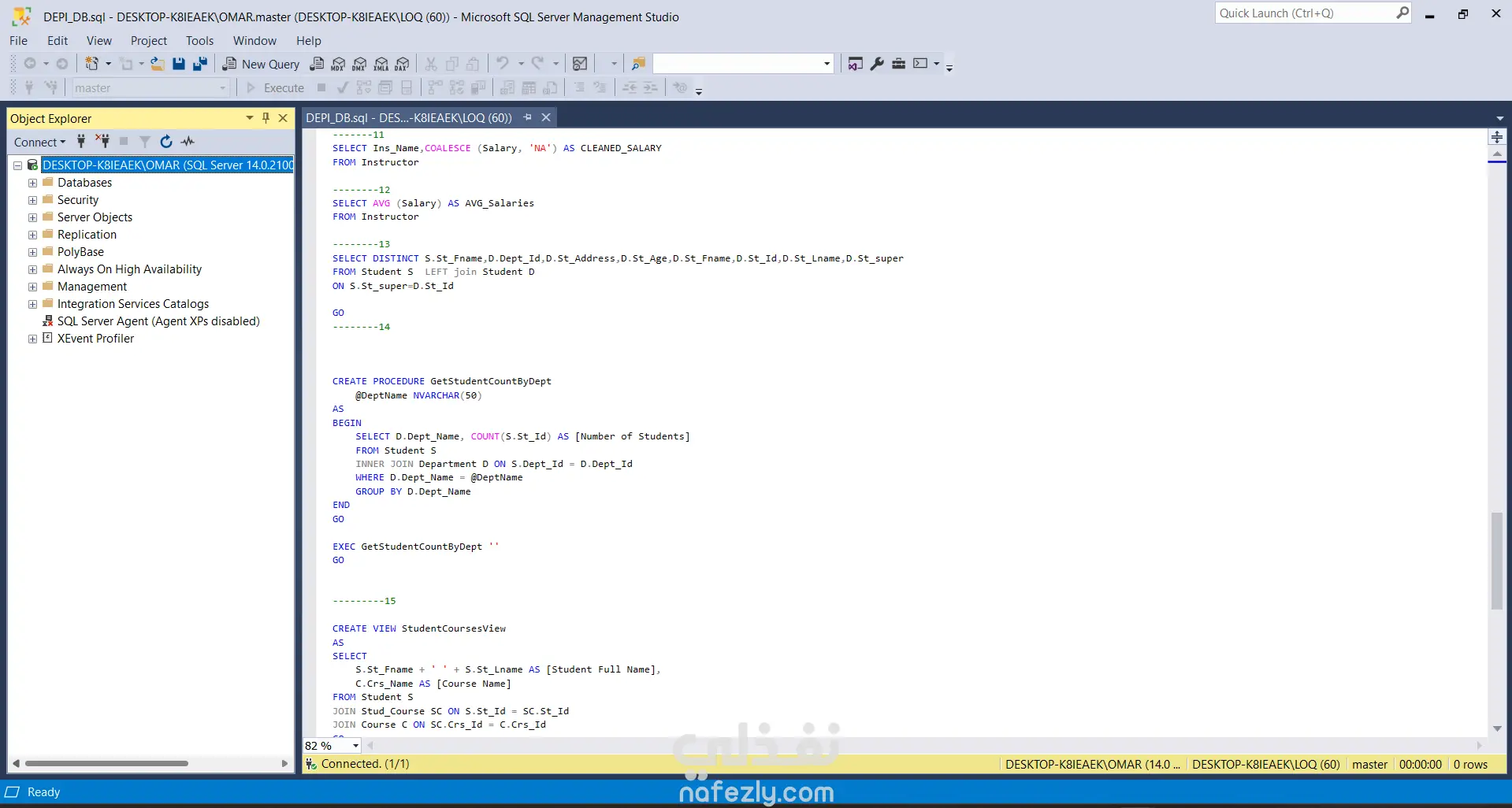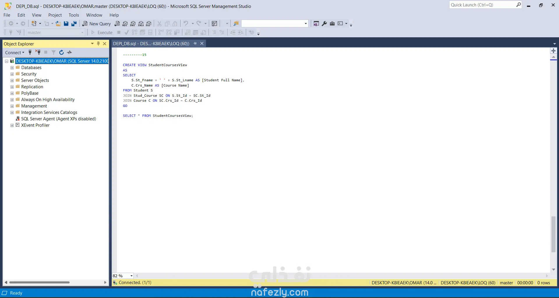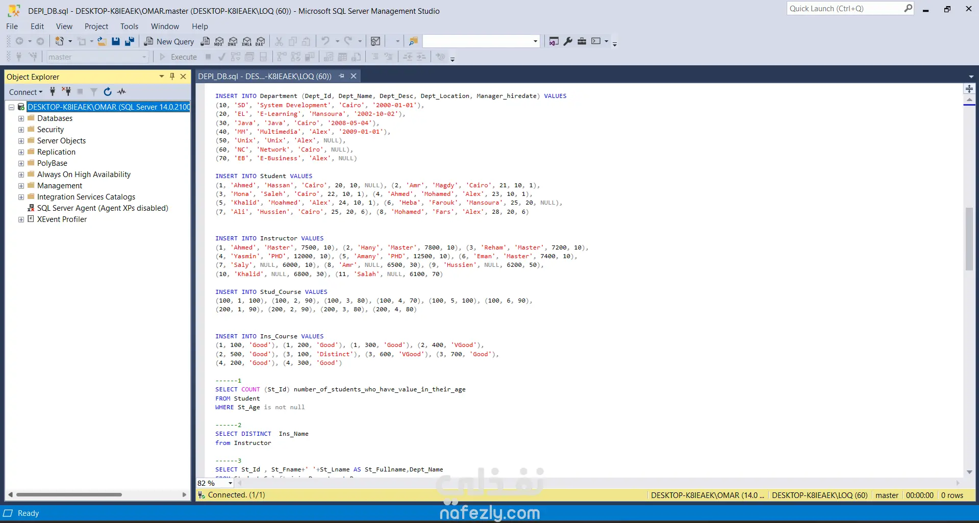 قمت بتنفيذ مشروع تصميم وإدارة قاعدة بيانات تعليمية باستخدام Microsoft SQL Server، حيث شمل المشروع إنشاء قاعدة بيانات متكاملة لإدارة بيانات الطلاب والدورات التدريبية والمدربين والأقسام. تضمن المشروع تصميم الجداول وربطها باستخدام العلاقات (Primary Keys وForeign Keys) لضمان سلامة البيانات وتنظيمها بشكل صحيح. كما قمت بإدخال بيانات تجريبية لمحاكاة نظام تعليمي حقيقي يحتوي على طلاب، مدربين، دورات، وموضوعات تعليمية. بعد بناء قاعدة البيانات قمت بتنفيذ مجموعة من استعلامات SQL التحليلية لاستخراج معلومات مهمة مثل: عدد الطلاب المسجلين أسماء المدربين المميزة ربط الطلاب بالأقسام تحليل الدورات حسب الموضوع حساب أعلى وأقل رواتب للمدربين مقارنة الرواتب مع متوسط الرواتب استخراج أفضل القيم باستخدام عمليات التجميع (Aggregation) كما قمت بإنشاء: Stored Procedure لاستخراج عدد الطلاب داخل قسم معين. View لعرض بيانات الطلاب والدورات المسجلين بها بطريقة منظمة. يساعد هذا المشروع على إظهار القدرة على تصميم قواعد البيانات وكتابة استعلامات SQL متقدمة لاستخراج وتحليل البيانات بكفاءة.