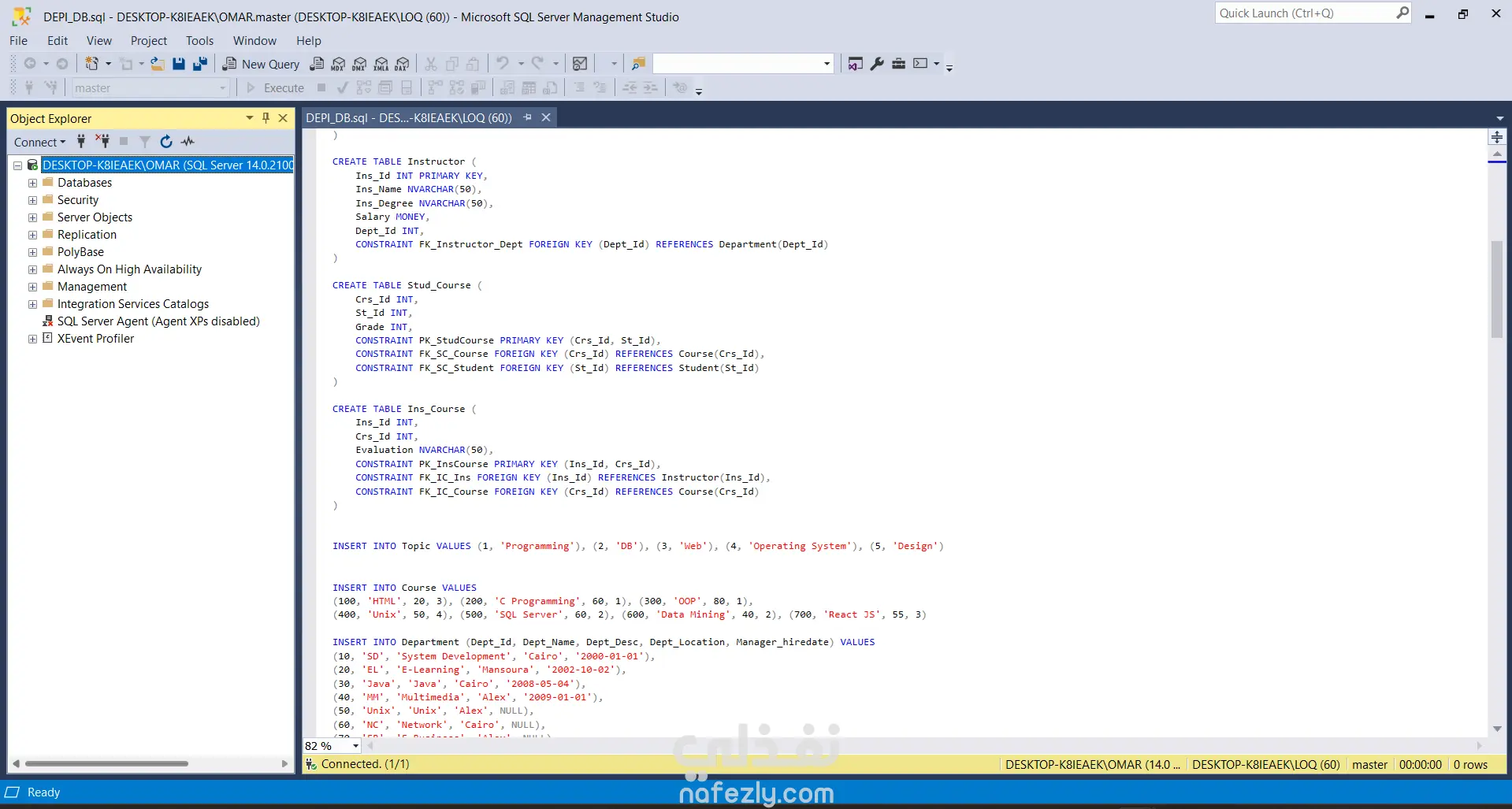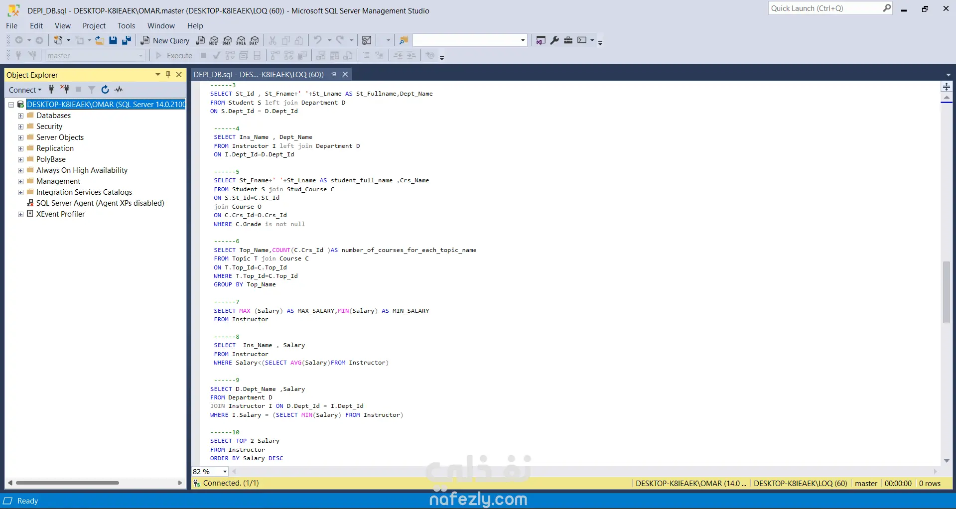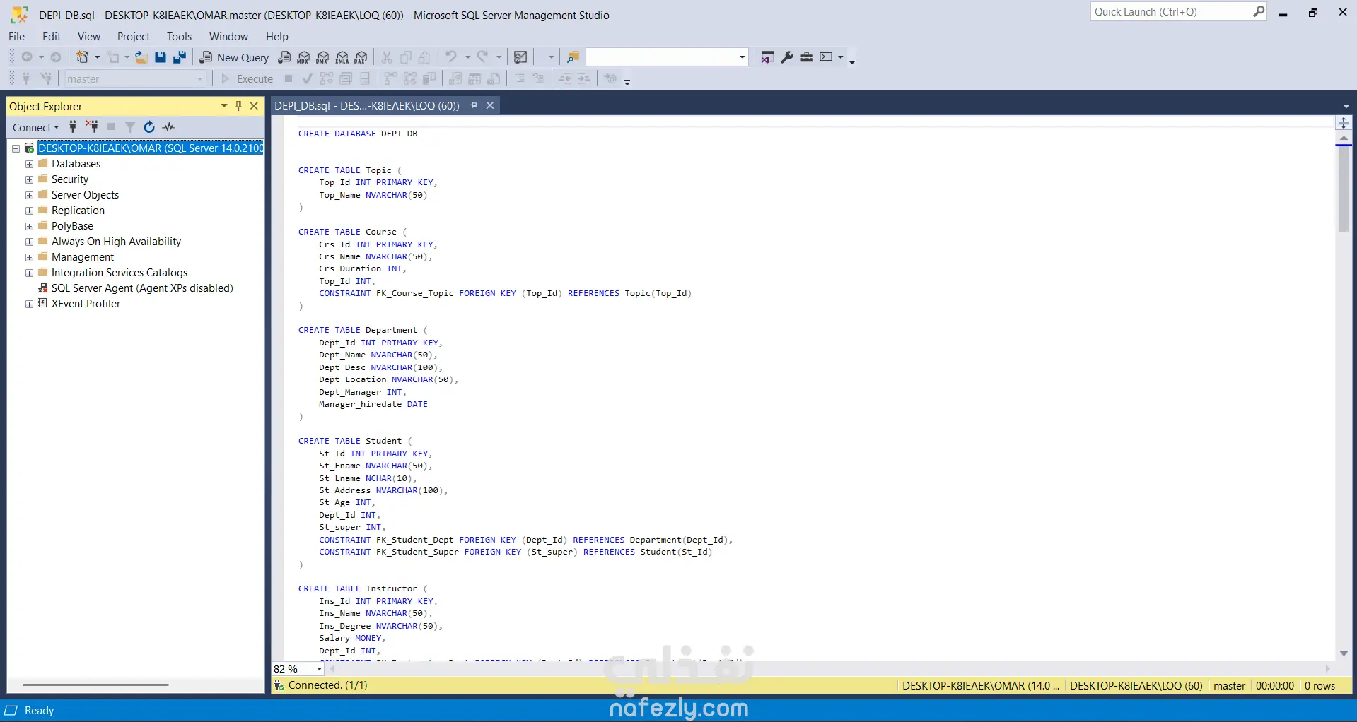 قمت بتنفيذ مشروع تصميم وإدارة قاعدة بيانات تعليمية باستخدام Microsoft SQL Server، حيث شمل المشروع إنشاء قاعدة بيانات متكاملة لإدارة بيانات الطلاب والدورات التدريبية والمدربين والأقسام. تضمن المشروع تصميم الجداول وربطها باستخدام العلاقات (Primary Keys وForeign Keys) لضمان سلامة البيانات وتنظيمها بشكل صحيح. كما قمت بإدخال بيانات تجريبية لمحاكاة نظام تعليمي حقيقي يحتوي على طلاب، مدربين، دورات، وموضوعات تعليمية. بعد بناء قاعدة البيانات قمت بتنفيذ مجموعة من استعلامات SQL التحليلية لاستخراج معلومات مهمة مثل: عدد الطلاب المسجلين أسماء المدربين المميزة ربط الطلاب بالأقسام تحليل الدورات حسب الموضوع حساب أعلى وأقل رواتب للمدربين مقارنة الرواتب مع متوسط الرواتب استخراج أفضل القيم باستخدام عمليات التجميع (Aggregation) كما قمت بإنشاء: Stored Procedure لاستخراج عدد الطلاب داخل قسم معين. View لعرض بيانات الطلاب والدورات المسجلين بها بطريقة منظمة. يساعد هذا المشروع على إظهار القدرة على تصميم قواعد البيانات وكتابة استعلامات SQL متقدمة لاستخراج وتحليل البيانات بكفاءة.