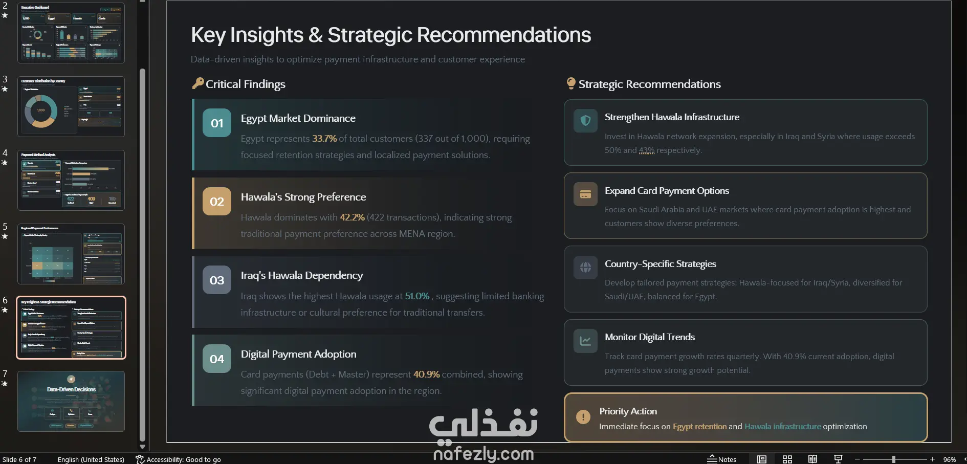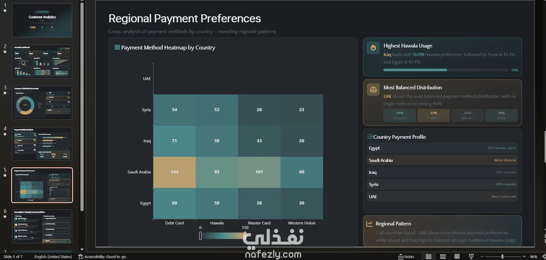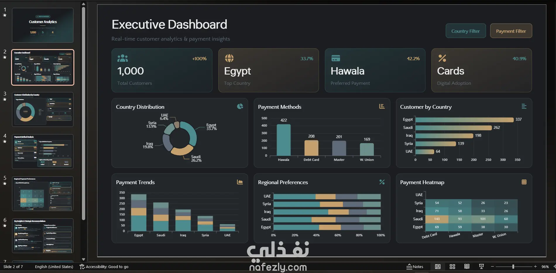 قمت بتنفيذ مشروع تحيل بيانات العملاء بهدف فهم سلوك المستخدمين وأنماط الدفع المختلفة عبر عدة دول في منطقة الشرق الأوسط وشمال أفريقيا. بدأت بتنظيف البيانات وتحليلها لاستخراج أهم المؤشرات، مثل: توزيع العملاء حسب الدول تحليل طرق الدفع المختلفة مقارنة بين الدفع التقليدي والرقمي دراسة الاتجاهات والأنماط في سلوك العملاء بعد ذلك قمت بتصميم Dashboard تفاعلي احترافي يعرض البيانات بشكل بصري واضح، ويحتوي على: مؤشرات رئيسية (KPIs) مثل عدد العملاء ونسب التوزيع رسوم بيانية لتوزيع العملاء جغرافياً تحليل طرق الدفع (Hawala – Cards – Western Union) مقارنة بين الاستخدام التقليدي والرقمي Heatmap لتحليل تفضيلات الدفع حسب كل دولة كما قمت باستخراج Insights استراتيجية مهمة مثل: هيمنة دولة مصر من حيث عدد العملاء (~33.7%) انتشار الدفع التقليدي (Hawala) بنسبة كبيرة (~42%) اعتماد العراق بشكل كبير على التحويلات التقليدية نمو ملحوظ في استخدام الدفع الرقمي (~40.9%) وانتهى المشروع بتقديم توصيات عملية (Business Recommendations) تساعد في تحسين استراتيجيات الدفع وزيادة نمو العملاء.