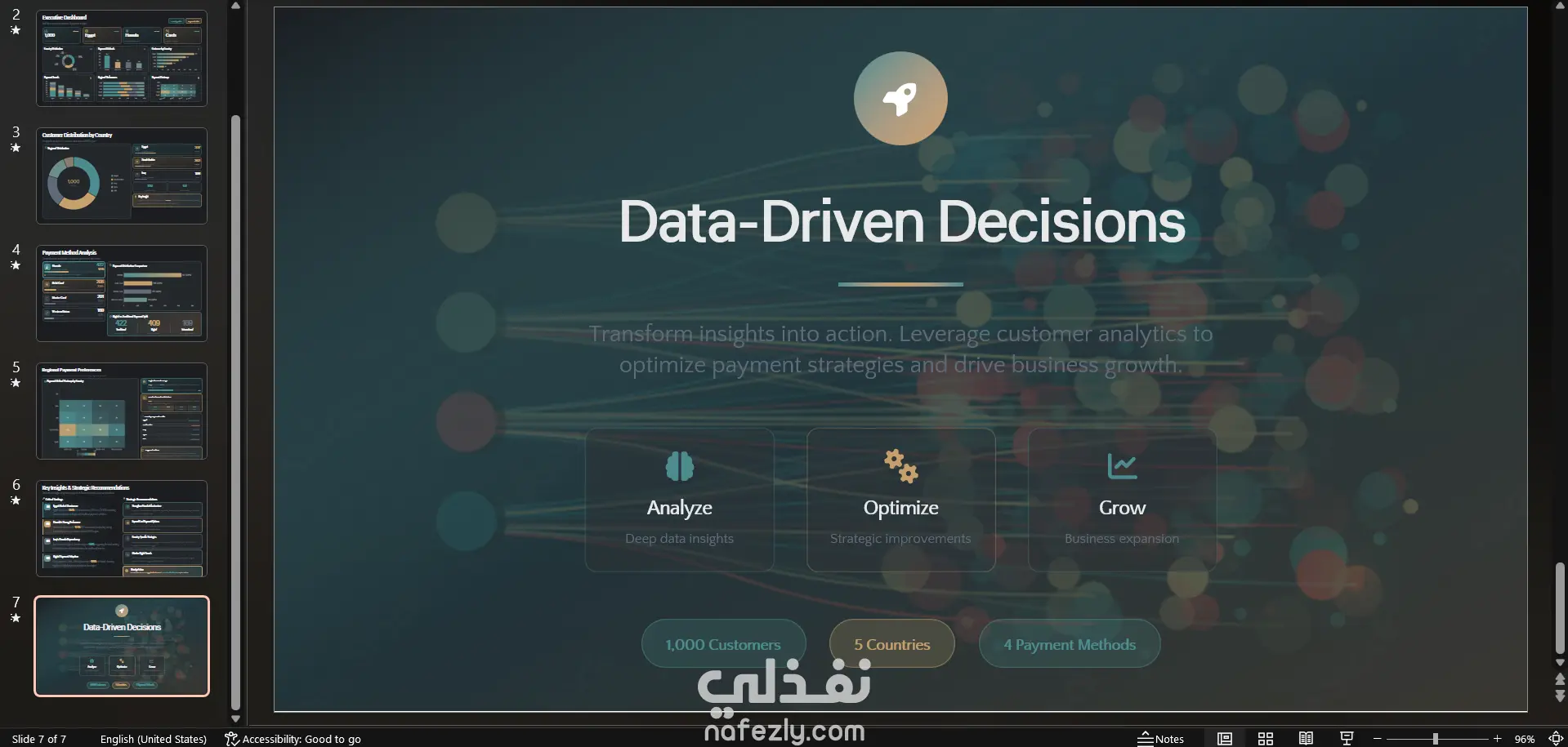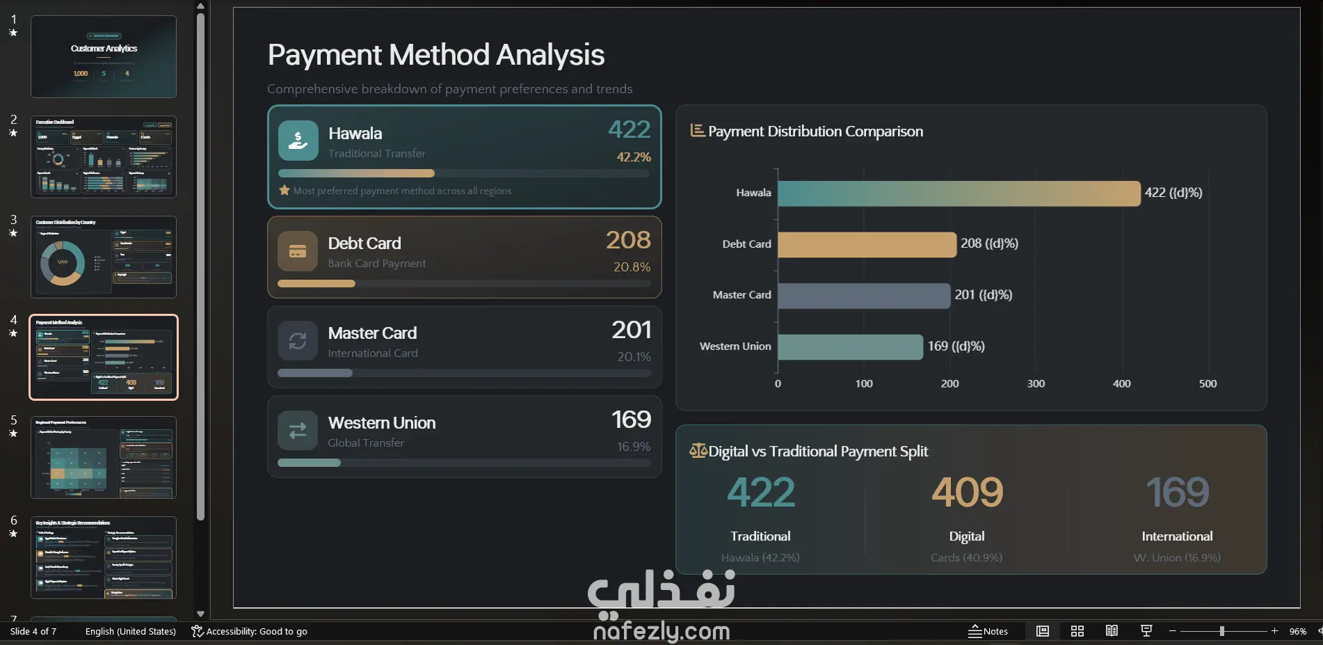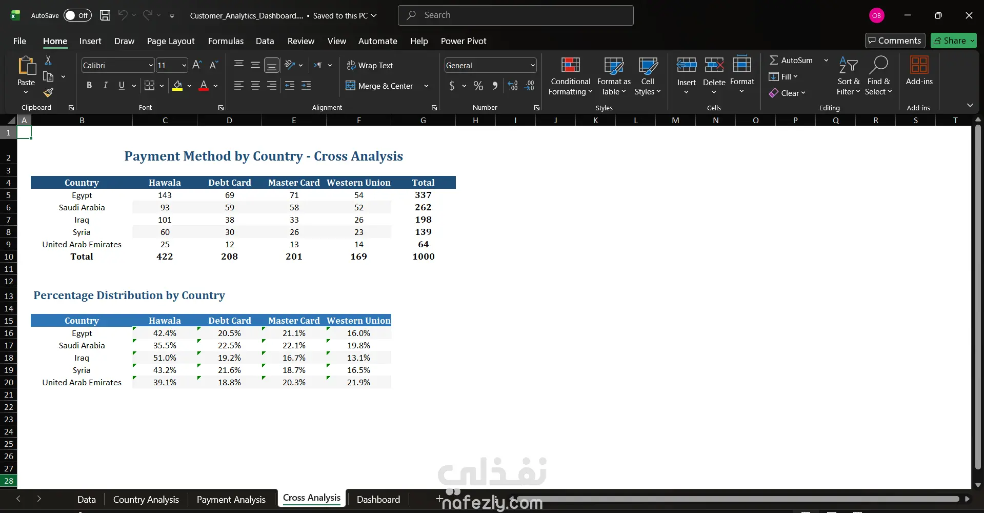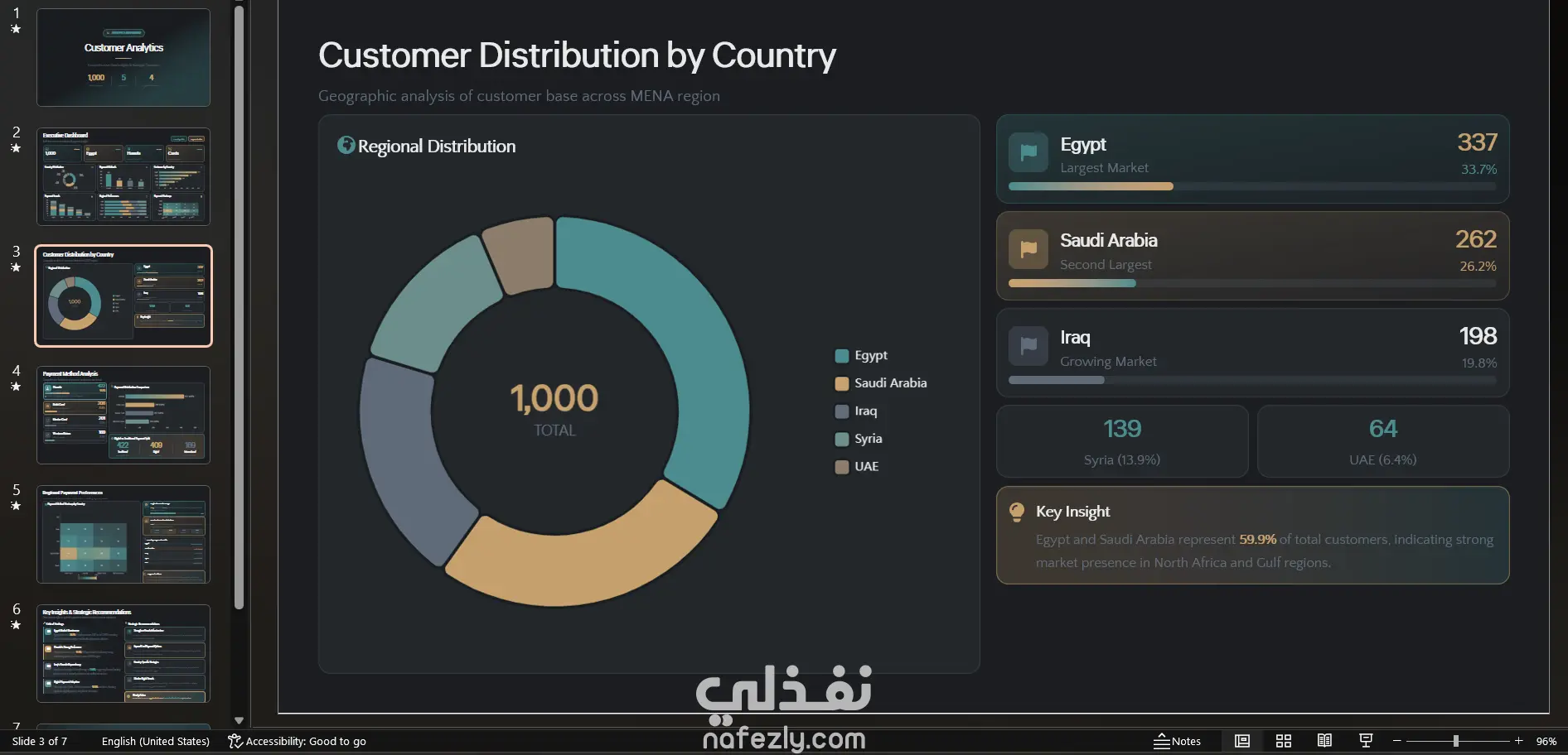قمت بتنفيذ مشروع تحيل بيانات العملاء بهدف فهم سلوك المستخدمين وأنماط الدفع المختلفة عبر عدة دول في منطقة الشرق الأوسط وشمال أفريقيا. بدأت بتنظيف البيانات وتحليلها لاستخراج أهم المؤشرات، مثل: توزيع العملاء حسب الدول تحليل طرق الدفع المختلفة مقارنة بين الدفع التقليدي والرقمي دراسة الاتجاهات والأنماط في سلوك العملاء بعد ذلك قمت بتصميم Dashboard تفاعلي احترافي يعرض البيانات بشكل بصري واضح، ويحتوي على: مؤشرات رئيسية (KPIs) مثل عدد العملاء ونسب التوزيع رسوم بيانية لتوزيع العملاء جغرافياً تحليل طرق الدفع (Hawala – Cards – Western Union) مقارنة بين الاستخدام التقليدي والرقمي Heatmap لتحليل تفضيلات الدفع حسب كل دولة كما قمت باستخراج Insights استراتيجية مهمة مثل: هيمنة دولة مصر من حيث عدد العملاء (~33.7%) انتشار الدفع التقليدي (Hawala) بنسبة كبيرة (~42%) اعتماد العراق بشكل كبير على التحويلات التقليدية نمو ملحوظ في استخدام الدفع الرقمي (~40.9%) وانتهى المشروع بتقديم توصيات عملية (Business Recommendations) تساعد في تحسين استراتيجيات الدفع وزيادة نمو العملاء.