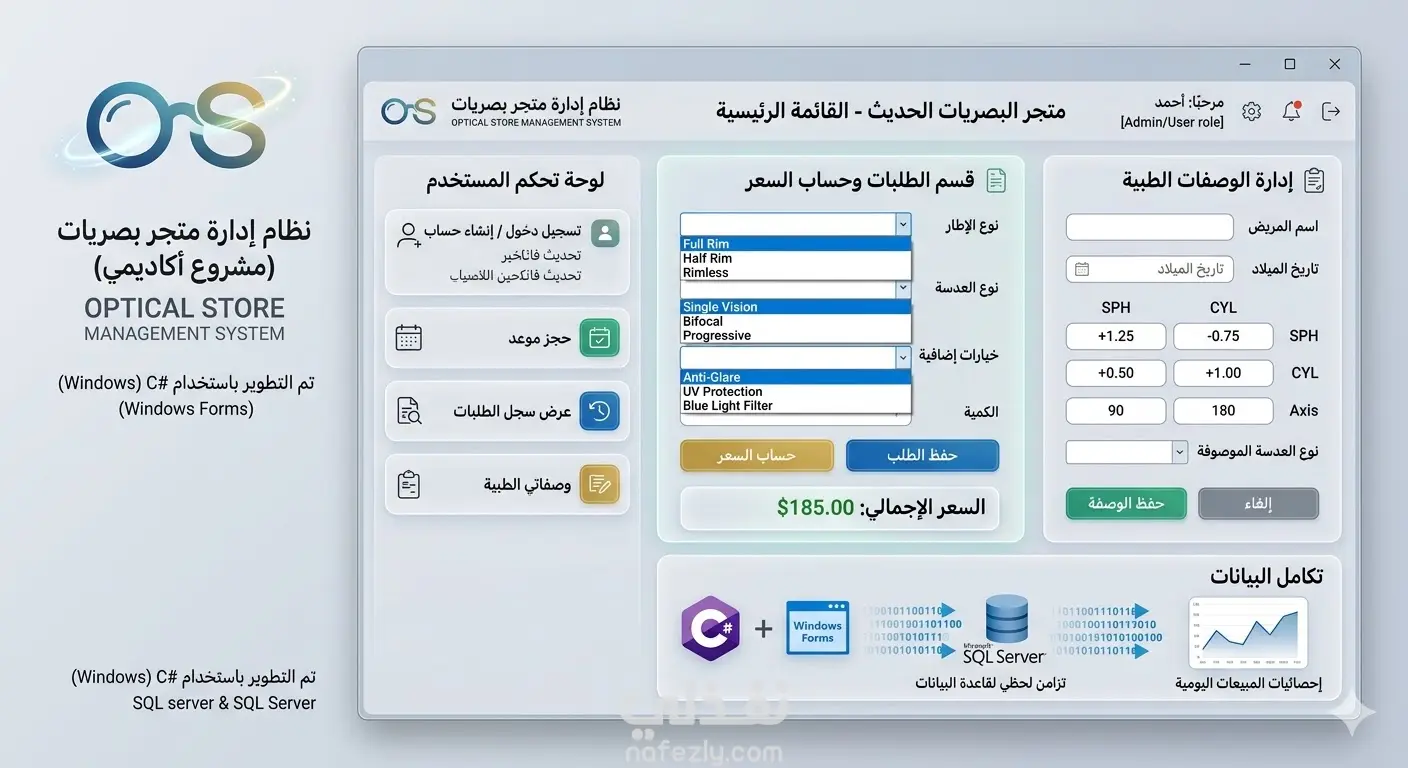 تطوير تطبيق سطح مكتب (Desktop Application): باستخدام لغة #C وإطار عمل Windows Forms، مع الاعتماد على SQL Server كقاعدة بيانات خلفية لإدارة البيانات بشكل موثوق. تطبيق مفاهيم البرمجة الكائنية (OOP): لضمان كتابة كود برمجي منظم، قابل للتطوير، وسهل الصيانة (Modular and Maintainable Code). إدارة حسابات المستخدمين (User Accounts): تزويد المستخدمين بالقدرة على إنشاء حسابات جديدة (Signup)، تسجيل الدخول الآمن (Login)، وتخزين بيانات الاتصال والعنوان في قاعدة البيانات. وحدة الحجز والطلبات التفاعلية (Interactive Ordering): تمكين المستخدمين من تحديد مواصفات الإطارات والعدسات، إضافة خيارات إضافية، وحساب التكلفة الإجمالية ديناميكياً قبل حفظ الطلب في قاعدة البيانات. إدارة الوصفات الطبية (Prescription Management): توفير واجهة مخصصة للمستخدمين لإدخال وتخزين تفاصيل الوصفات الطبية الخاصة بالعيون (مثل قياسات SPH، CYL، Axis) وربطها بحساباتهم. تكامل قاعدة البيانات لحظياً: تنفيذ عمليات (CRUD) الأساسية لضمان تحديث بيانات المستخدمين، والطلبات، والوصفات الطبية تلقائياً وفورياً في نظام SQL Server. تحسين تجربة المستخدم (UX): تصميم واجهات مستخدم عصرية وبسيطة تضمن سهولة التنقل والاستخدام، مع تخصيص مظهر عناصر التحكم برمجيًا (Form Load Events).