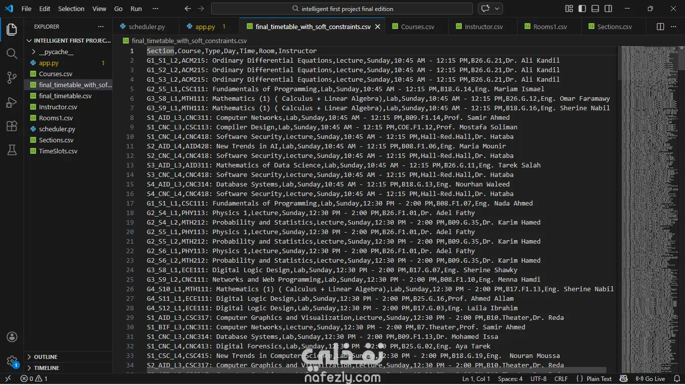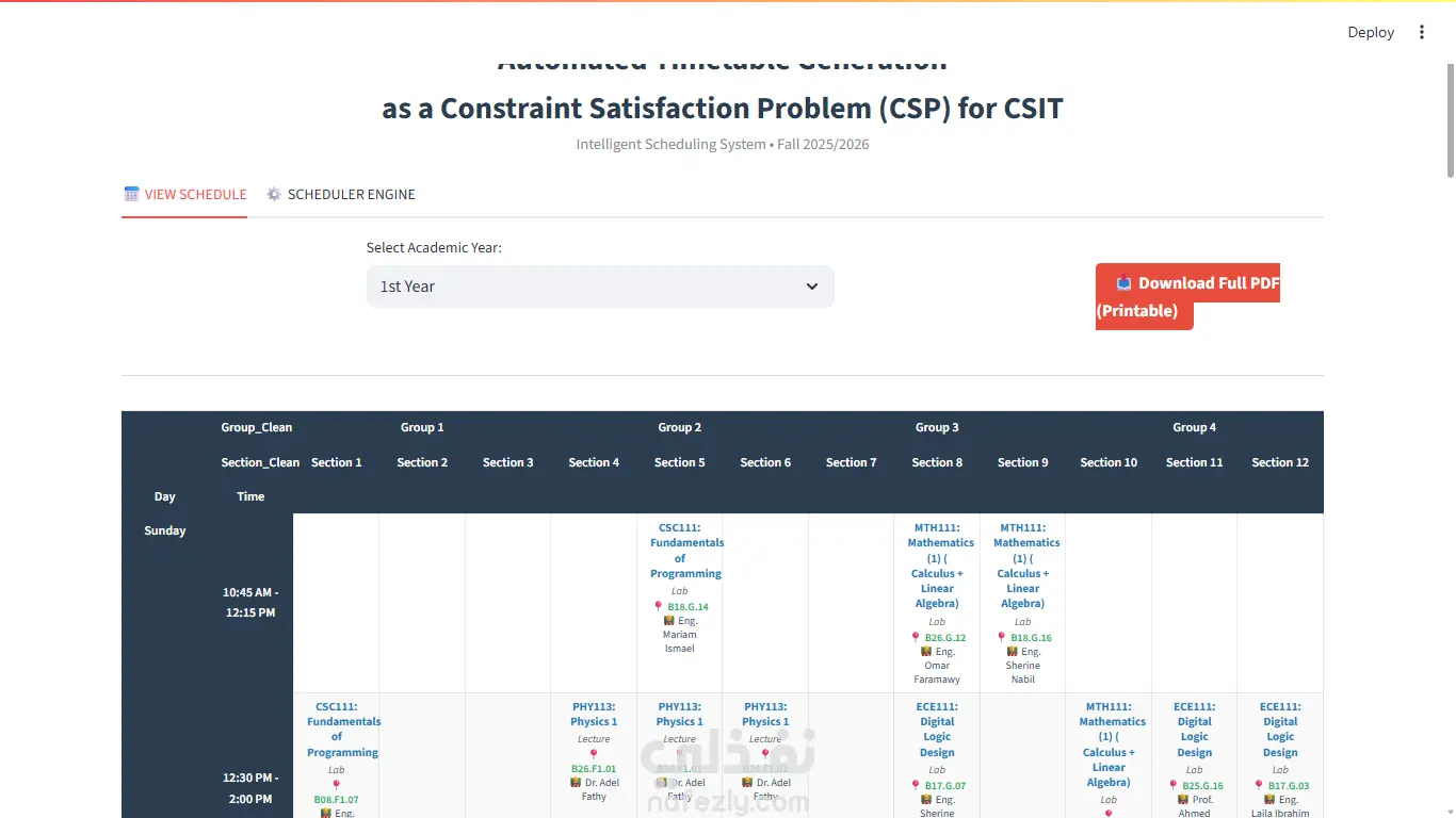 قمت بتطوير نظام متكامل ومؤتمت بالكامل لإنشاء الجداول الدراسية الجامعية (University Timetable Scheduling System) لقسم علوم الحاسب وتكنولوجيا المعلومات (CSIT). يهدف المشروع إلى حل مشكلة الجدولة المعقدة (NP-Hard Problem) التي تستغرق عادةً أياماً من العمل اليدوي، وإنجازها في دقائق معدودة بدقة 100%. المشكلة التي قمت بحلها: إنشاء جدول دراسي يأخذ في الاعتبار مئات القيود المتداخلة (توفر القاعات، تخصصات المحاضرين، عدم تعارض أوقات الطلاب، وسعة المعامل) هو تحدٍ رياضي وبرمجي كبير. الحل التقني والمميزات: قمت ببناء "محرك جدولة ذكي" (Intelligent Scheduling Engine) باستخدام لغة Python ومكتبات الذكاء الاصطناعي، ويتميز النظام بالتالي: منع التعارضات نهائياً (Hard Constraints): يضمن النظام عدم وجود أي تعارض في القاعات، أو أوقات المحاضرين، أو جداول الطلاب (Zero Conflicts). تحسين جودة الجدول (Soft Constraints Optimization): استخدام خوارزميات البحث الهجين (Hybrid Solver) التي تدمج بين (Backtracking) و (Hill Climbing) لتقليل الفجوات الزمنية (Gaps) بين المحاضرات وتجنب التأخير الدراسي، مما حقق تحسناً في جودة الجدول بنسبة 52%. لوحة تحكم تفاعلية (Interactive Dashboard): واجهة مستخدم متطورة باستخدام إطار عمل Streamlit تتيح للمستخدمين: تشغيل المحرك الذكي بضغطة زر. استعراض الجداول وتصفيتها حسب السنة الدراسية (L1, L2, L3, L4). تصدير الجداول النهائية بصيغة PDF جاهزة للطباعة أو ملفات CSV. معالجة القيود الهرمية: برمجة منطق متقدم للتعامل مع "المحاضرات المجمعة" (Unified Lecture Grouping) حيث يتم دمج عدة مجموعات في محاضرة واحدة، وفصلهم في المعامل العملية تلقائياً. التقنيات والأدوات المستخدمة: لغة البرمجة: Python. واجهة المستخدم: Streamlit. معالجة البيانات: Pandas. الخوارزميات: Constraint Satisfaction Problems (CSP), Heuristic Search (Fail-First), Hill Climbing. هذا المشروع يمثل نموذجاً قوياً لكيفية توظيف البرمجة لحل المشكلات الإدارية المعقدة وتوفير الوقت والمجهود