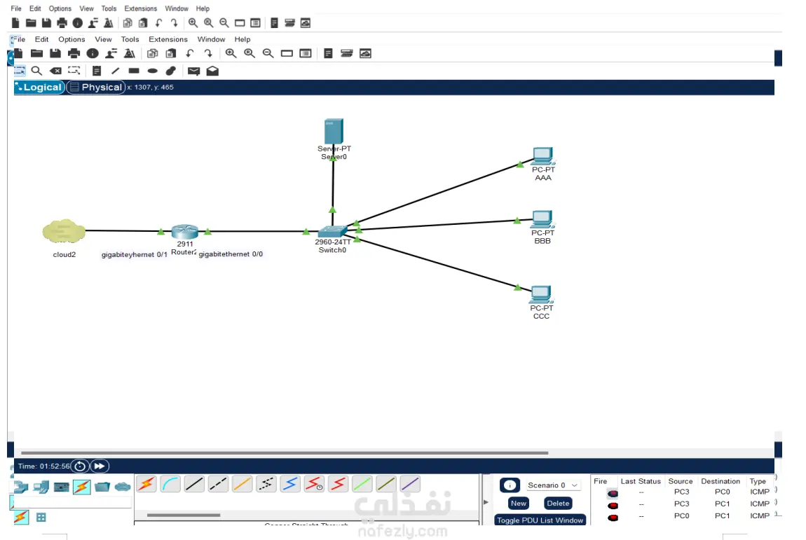 في ظل التحول الرقمي للعملية التعليمية، أصبحت الحاجة ملحة لوجود بنية تحتية تقنية قوية وموثوقة تدعم التفاعل بين الطلاب وأعضاء هيئة التدريس. يقدم هذا المشروع نموذجاً متكاملاً لشبكة محلية (LAN) تم تصميمها ومحاكاتها باستخدام برنامج Cisco Packet Tracer، بهدف إنشاء بيئة تعليمية ذكية تربط بين فصل دراسي يضم 25 طالباً وقسم تكنولوجيا المعلومات بالكلية (IT Department). تفاصيل التنفيذ: تم إنشاء شبكتين محليتين منفصلتين وربطهما عبر سحابة إلكترونية (Cloud) لمحاكاة الاتصال عبر شبكة واسعة (WAN): الشبكة الأولى (الفصل الدراسي): تضم 25 جهاز كمبيوتر للطلاب، تم تزويد كل منها بعنوان IP خاص (Private IP) ضمن نطاق 192.168.1.0/24، وتم إنشاء حساب بريد إلكتروني وكلمة مرور فريدة لكل طالب. الشبكة الثانية (قسم IT): تضم 3 أجهزة للموظفين والإداريين، تعمل على نطاق عناوين منفصل 192.168.2.0/24. المكونات والتقنيات المستخدمة: الأجهزة: تم استخدام أجهزة سويتش (Cisco 2960 Switch) لتجميع الأجهزة داخل كل شبكة، وراوتر (Router) لتوجيه حركة البيانات بين الشبكتين وإلى الإنترنت، وخوادم (Servers) لتقديم الخدمات. الخدمات المطبقة: خدمة البريد الإلكتروني (Email Service): تم تكوين خادم بريد في كل شبكة لتمكين الطلاب والموظفين من إرسال واستقبال الرسائل الإلكترونية داخلياً. خدمة نقل الملفات (FTP Service): تم تفعيل خدمة FTP على الخوادم، مع صلاحيات قراءة، كتابة، حذف، وإعادة تسمية للملفات، مما يسمح بمشاركة الموارد الأكاديمية بكفاءة. خدمة DHCP: تم تكوين الخوادم لتوزيع العناوين IP تلقائياً على الأجهزة. الاتصال: تم ربط الشبكتين عبر "سحابة" (Cloud-PT) بكلمة مرور موحدة، لمحاكاة الاتصال الآمن عبر الإنترنت. النتائج والتحقق: تم اختبار الشبكة بنجاح باستخدام عدة طرق: أمر Ping: للتأكد من الاتصال المنطقي بين الأجهزة في الشبكتين. إرسال واستقبال الإيميلات: تم بنجاح إرسال رسائل بين طالبين (Adel و Marwa) والتأكد من وصولها وفتحها والرد عليها، مما يثبت كفاءة عمل خادم البريد. الوصول إلى الخادم: تأكدنا من قدرة الأجهزة على الوصول إلى الخدمات المختلفة. المميزات التنافسية للمشروع: بيئة متكاملة: المشروع لا يقتصر على الربط الشبكي فقط، بل يقدم خدمات حقيقية (Email, FTP) تحاكي بيئة العمل الفعلية في المؤسسات التعليمية. قابلية التطوير (Scalability): التصميم يسمح بإضافة المزيد من الطلاب أو الفصول الدراسية بسهولة. الأمان: استخدام شبكات محلية منفصلة (VLANs) وعناوين IP خاصة مع نقطة اتصال واحدة بالعالم الخارجي يحاكي مفهوم أمن الشبكات (NAT/Firewall). تطبيق عملي: يمثل هذا المشروع حلاً جاهزاً للتنفيذ في أي مختبر مدرسي أو جامعي. المهارات المعروضة: تصميم وتخطيط الشبكات المحلية (LAN Design). إعداد وتكوين أجهزة Cisco ( routers & switches). إعداد خوادم البريد الإلكتروني (Email Servers) وخدمات الملفات (FTP). استخدام برامج المحاكاة المتقدمة (Cisco Packet Tracer). تطبيق مفهوم الشبكات الخاصة الافتراضية (VPN) باستخدام سحابة PT. حل مشاكل الاتصال وتحليل حركة البيانات.