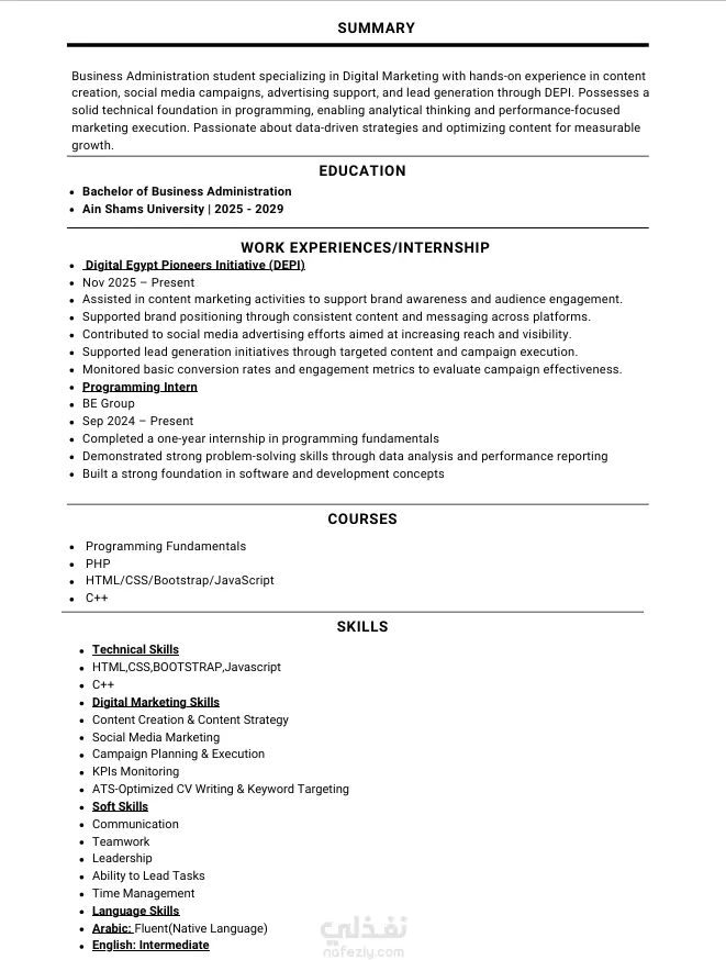 تصميم بسيط واحترافي يحقق التوازن بين الشكل الجذاب والقبول التقني لدى أنظمة التوظيف.