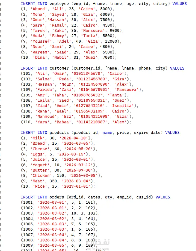 قمت بتصميم وتنفيذ قاعدة بيانات باستخدام SQL لإدارة عمليات المبيعات والطلبات داخل نظام بسيط لإدارة متجر أو شركة. يهدف النظام إلى تنظيم البيانات وتسهيل عمليات الإدارة والاستعلام عن المعلومات بشكل سريع وفعّال. تعتمد قاعدة البيانات على مجموعة من الجداول المرتبطة ببعضها من خلال العلاقات بين المفاتيح الأساسية والخارجية، مما يسمح بإدارة البيانات بطريقة منظمة. الجداول الرئيسية في النظام جدول الموظفين (Employee) يحتوي على بيانات الموظفين مثل رقم الموظف، الاسم الأول والأخير، العمر، المدينة، والراتب. جدول العملاء (Customer) يخزن بيانات العملاء مثل رقم العميل، الاسم الأول والأخير، رقم الهاتف، والمدينة. جدول المنتجات (Products) يتضمن معلومات المنتجات مثل رقم المنتج، اسم المنتج، السعر، وتاريخ انتهاء الصلاحية. جدول الطلبات (Orders) يسجل عمليات الشراء ويحتوي على رقم الطلب، تاريخ الطلب، الكمية، الموظف المسؤول عن الطلب، والعميل الذي قام بالشراء. جدول تفاصيل الطلب (Order Details) يستخدم لربط الطلبات بالمنتجات المختلفة الموجودة داخل كل طلب. مميزات قاعدة البيانات تصميم قاعدة بيانات علائقية منظمة استخدام Primary Keys و Foreign Keys لربط الجداول سهولة تنفيذ الاستعلامات واستخراج التقارير مناسب لأنظمة إدارة المبيعات والمتاجر