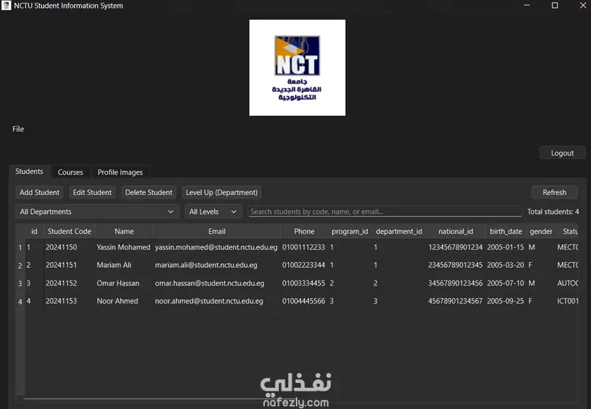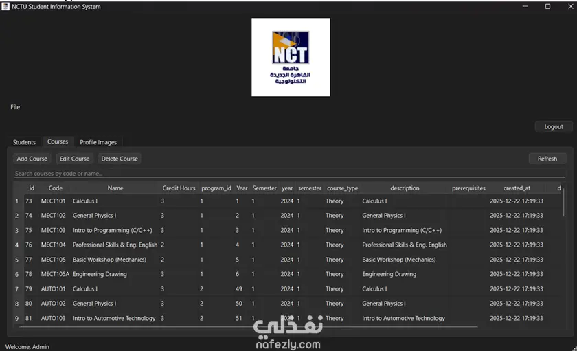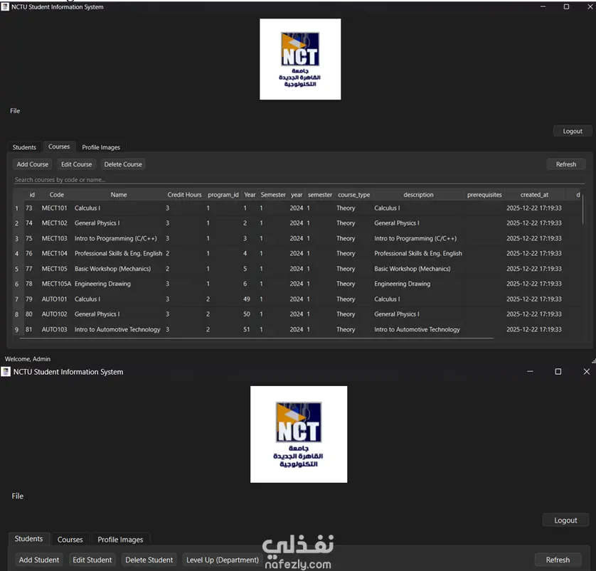 نظام إدارة طلاب (SIS) – تطبيق Desktop تم تطوير تطبيق سطح مكتب متكامل لإدارة بيانات الطلاب والامتحانات داخل المؤسسات التعليمية. يهدف النظام إلى تسهيل إدارة المعلومات الأكاديمية وتنظيم عملية متابعة الطلاب والدرجات بشكل بسيط وفعّال. يتكون النظام من ثلاث واجهات رئيسية: لوحة تحكم الأدمن (Admin Panel) تتيح للمسؤول إدارة النظام بالكامل، وتشمل: إضافة وتعديل وحذف بيانات الطلاب إضافة وتعديل بيانات الدكاترة تنظيم بيانات المستخدمين داخل النظام التحكم الكامل في قاعدة البيانات واجهة الدكتور (Doctor Panel) تمكن الدكاترة من إدارة العملية التعليمية الخاصة بهم، وتشمل: متابعة الطلاب المسجلين في المادة إضافة وتعديل درجات الامتحانات متابعة نتائج الطلاب بسهولة واجهة الطالب (Student Panel) تمكن الطالب من متابعة بياناته الأكاديمية، وتشمل: عرض البيانات الشخصية مشاهدة درجات الامتحانات معرفة الحالة الأكاديمية (ناجح / راسب) مميزات النظام: واجهة سهلة الاستخدام تنظيم واضح للبيانات سرعة في الوصول إلى المعلومات نظام صلاحيات بين الأدمن والدكاترة والطلاب مناسب للمدارس أو المعاهد أو الكليات الصغيرة