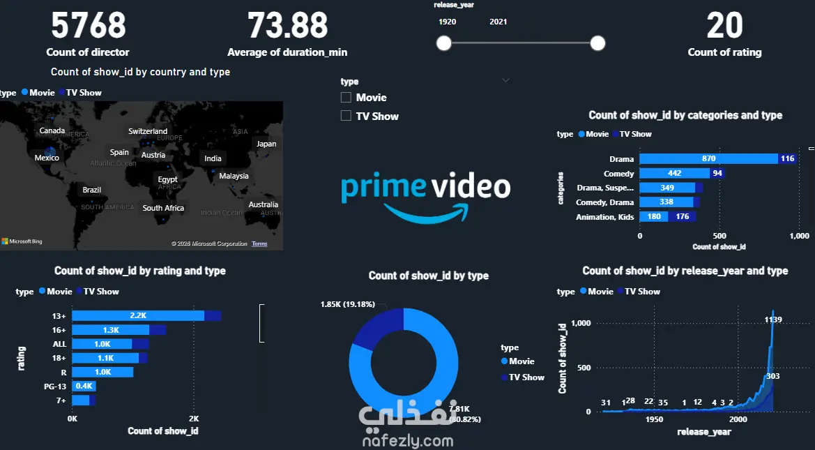 هذا المشروع يهدف إلى تحليل بيانات منصة Amazon Prime وإنشاء لوحة تحكم تفاعلية باستخدام Microsoft Power BI لعرض أهم الإحصائيات والأنماط الموجودة في بيانات الأفلام والمسلسلات. الهدف من المشروع هو تحويل البيانات الخام إلى رؤى واضحة تساعد على فهم المحتوى الموجود على المنصة مثل أنواع الأفلام، الدول المنتجة، والتوزيع الزمني للإصدارا