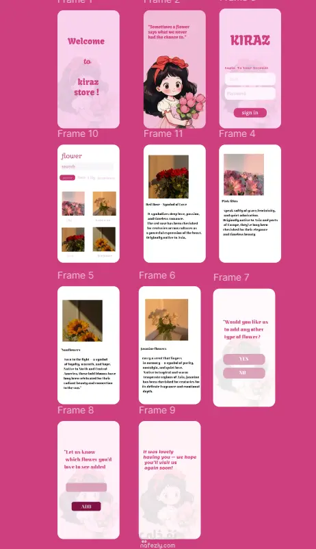 A Figma-designed mobile app called Kiraz Store that allows users to explore different types of flowers. Users can view images, read descriptions, and learn care tips for each flower