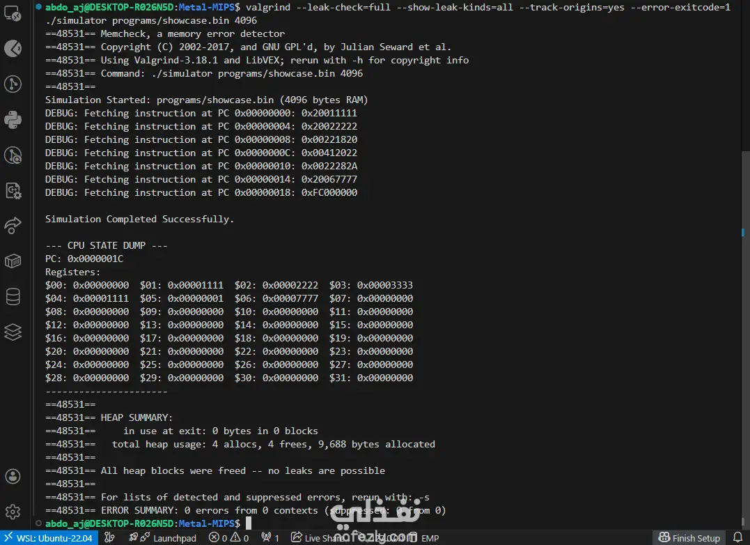 قمت ببناء محاكي متكامل لمعمارية MIPS البرمجية باستخدام لغة C الخالصة (Pure C). التحدي الحقيقي في هذا المشروع لم يكن مجرد كتابة كود، بل في هندسة معمارية مرنة تسمح بإضافة تعليمات جديدة (Instructions) دون الحاجة لتعديل محرك المحاكي الأساسي. التفاصيل التقنية: تصميم نظام Modular يفصل بين محرك التنفيذ وبين تعريفات التعليمات البرمجية. تنفيذ دورة (Fetch-Decode-Execute) بدقة عالية تضمن صحة حالات سجلات المعالج (Registers). إدارة الذاكرة بشكل يدوي لضمان محاكاة واقعية لعملية الوصول إلى البيانات (Memory Access).