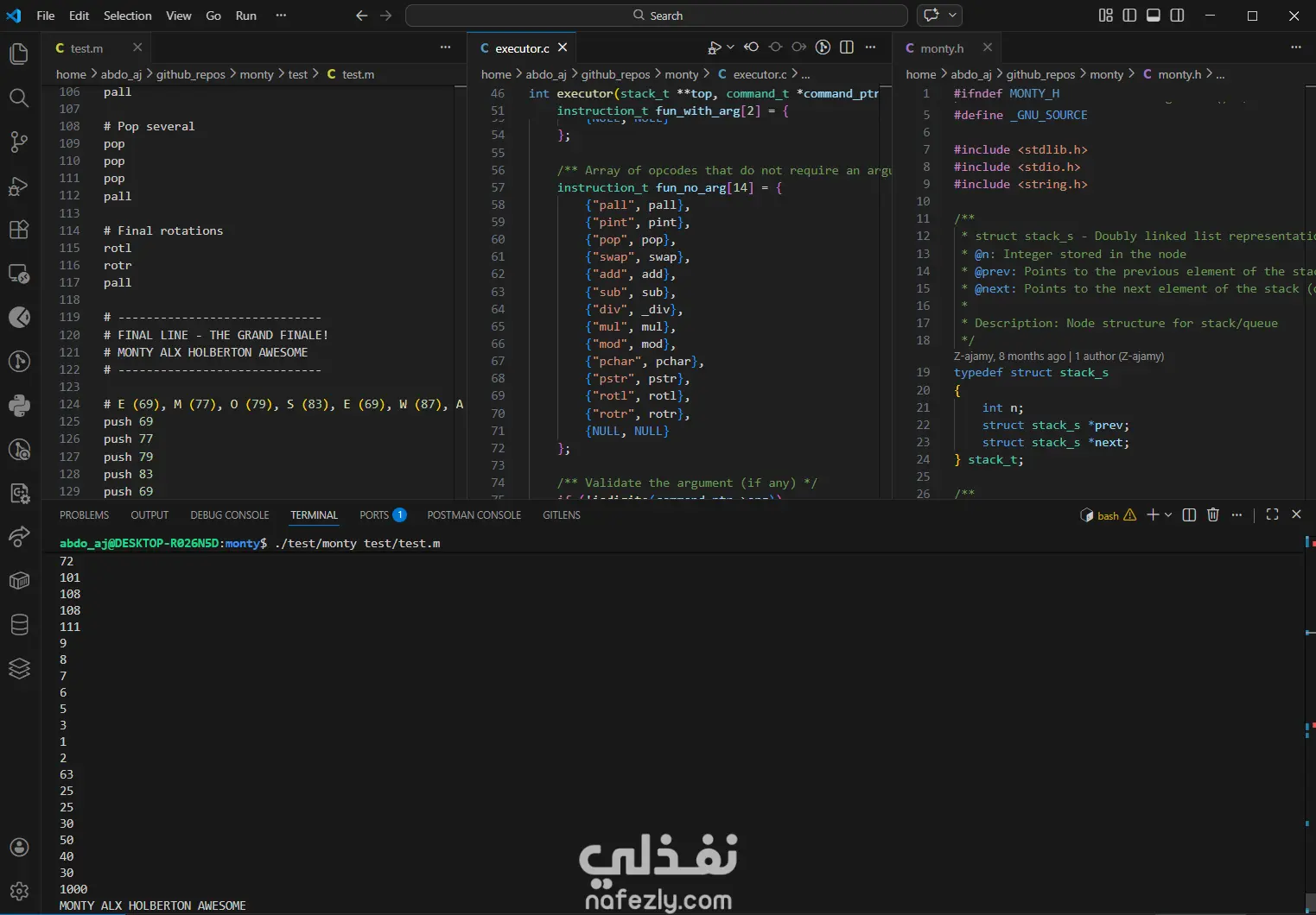 تطوير مفسر لغة (Interpreter) يعتمد على لغة Monty Bytecodes. المشروع يبرز القدرة على التعامل مع هياكل البيانات المعقدة في المستويات الدنيا (Low-level). التفاصيل التقنية: بناء نظام معالجة يدعم التحويل اللحظي بين وضعي المكدس (Stack) والطابور (Queue). إدارة الذاكرة يدوياً (Manual Memory Management) وضمان خلو النظام تماماً من أي تسريبات (Zero Memory Leaks) باستخدام أداة Valgrind. تصميم نظام لمعالجة الأخطاء يضمن خروج المفسر بشكل آمن مع تقارير دقيقة في حالات Stack Underflow أو الأوامر غير الصالحة.