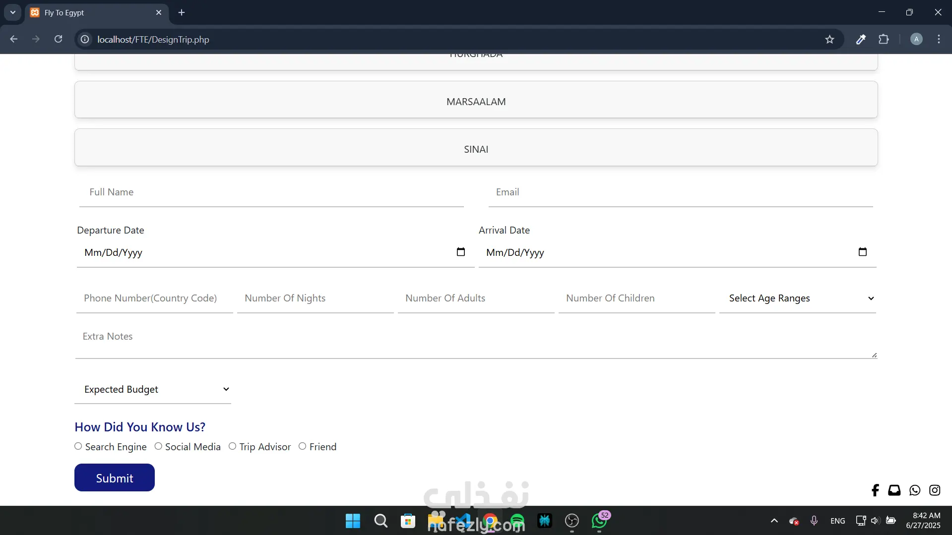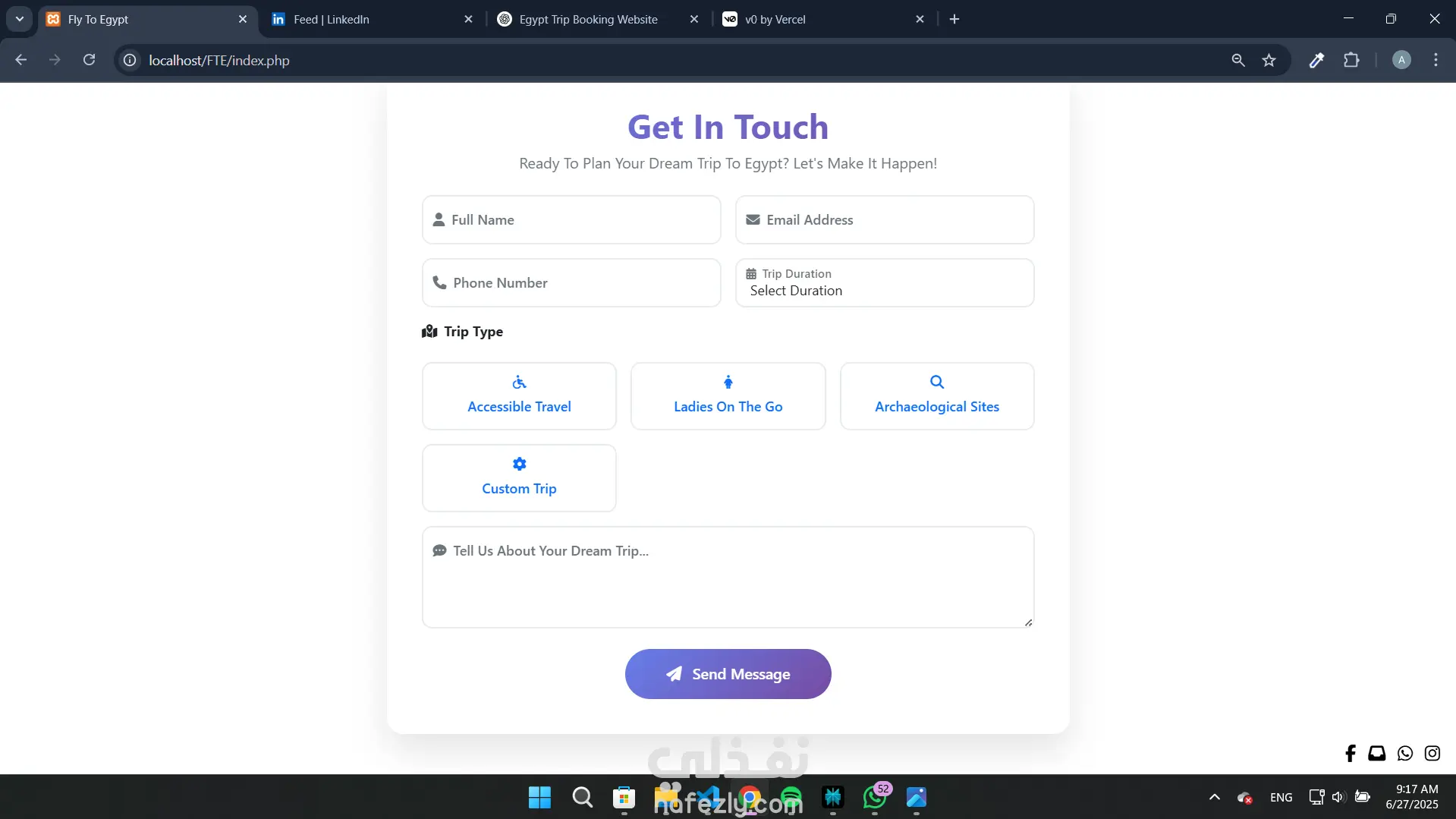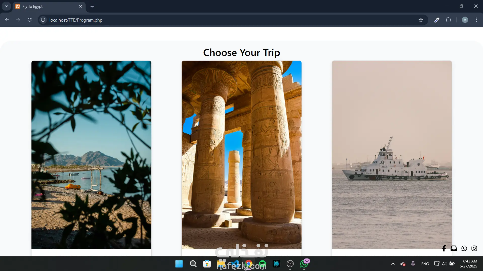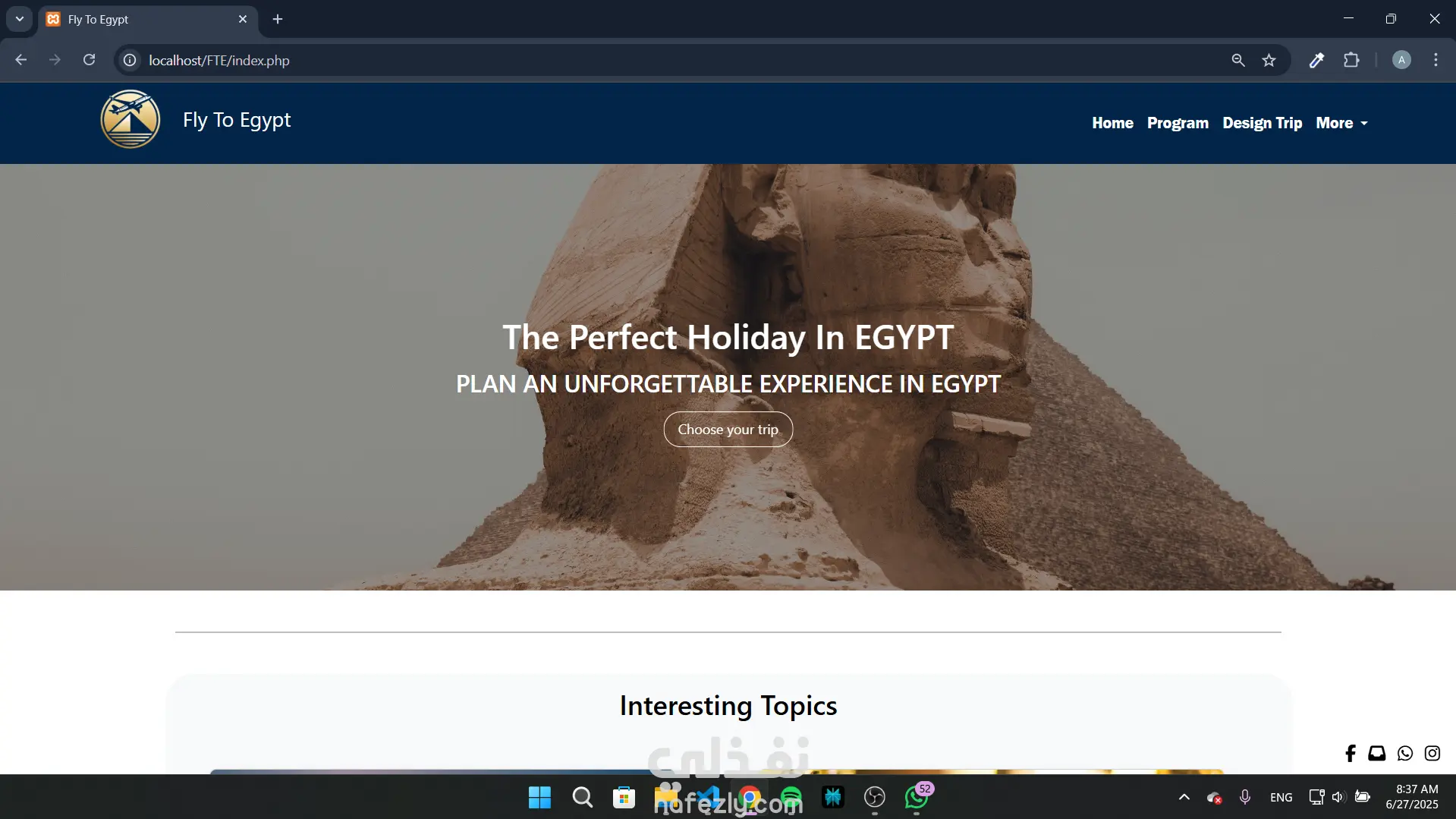Trip booking website for Egypt that offers both pre-designed travel packages and fully customizable trips based on the user’s preferred duration and interests. Includes specialized features such as women-only trips for safer travel experiences and accessibility-focused options for travelers with disabilities. Built using Laravel (PHP) for backend functionality and Bootstrap for a responsive, user-friendly interface.