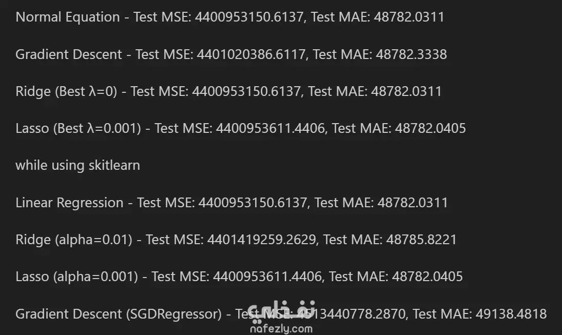 تنفيذ Linear, Ridge, Lasso من الصفر (Normal Equation + Gradient Descent)