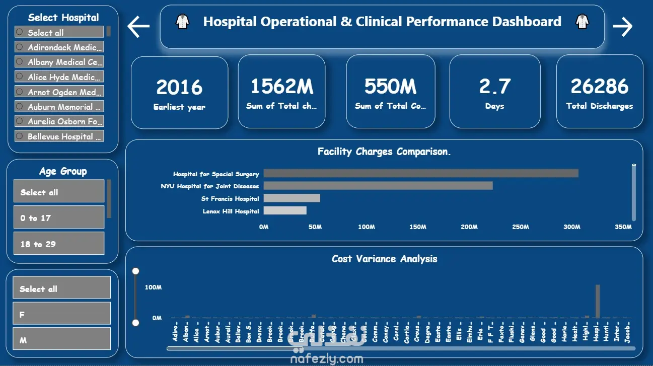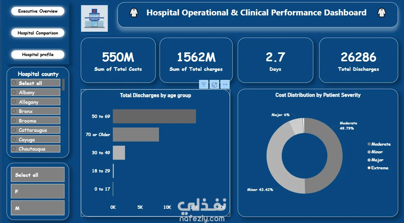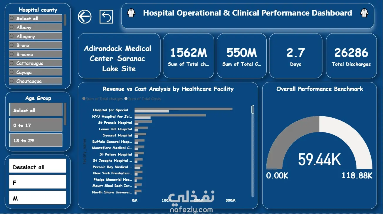 قمت بتطوير نظام متكامل لتحليل البيانات الصحية (Healthcare Analytics) من خلال لوحة بيانات تفاعلية تهدف إلى تحسين الكفاءة التشغيلية للمستشفيات ومراقبة الجودة السريرية مقابل التكاليف المالية.
