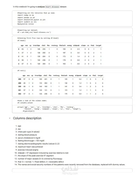 تحليل بيانات مرضى القلب لاكتشاف العوامل المرتبطة بالإصابة والتنبؤ بالحالات المحتملة.