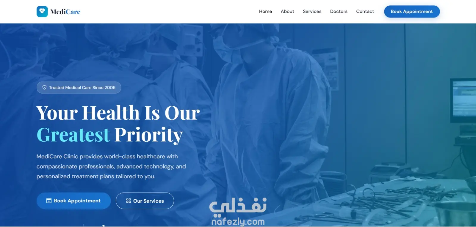 تم تصميم وتطوير موقع احترافي لمستشفى أو عيادة يركز على تجربة مستخدم سلسة وعرض المعلومات بشكل منظم وجذاب. الموقع يحتوي على الأقسام الأساسية: الصفحة الرئيسية، من نحن، الخدمات، الأطباء، وصفحة تواصل تحتوي على فورم يفتح WhatsApp عند الإرسال.