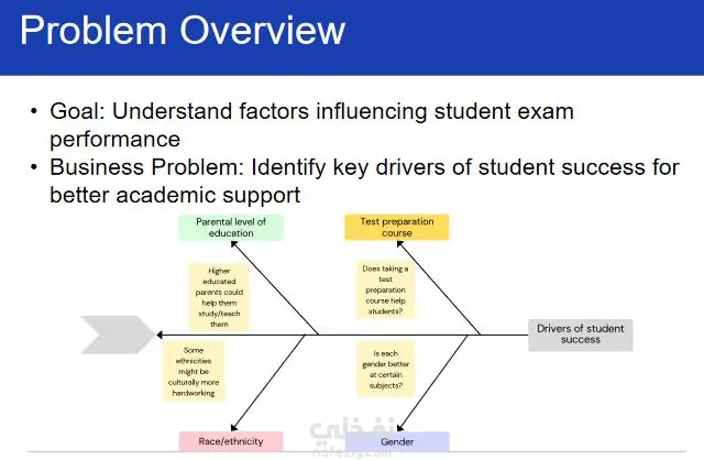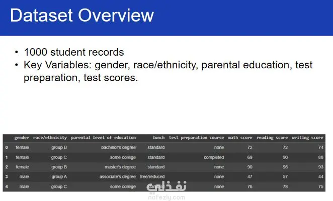يهدف هذا المشروع إلى فهم وتحليل العوامل المختلفة التي تؤثر على أداء الطلاب في الامتحانات، بهدف تحديد الدوافع الرئيسية لنجاحهم وتقديم توجيه ودعم أكاديمي أفضل. أبرز تفاصيل ومراحل المشروع: البيانات والتحضير: تم استخدام مجموعة بيانات تحتوي على 1000 سجل للطلاب. قمنا بتنظيف البيانات بالكامل وهندسة الميزات (Feature Engineering) باستخدام تقنيات مثل (One-hot encoding) وتهيئة المتغيرات الرقمية (Scaling). التحليل الاستكشافي والإحصائي: قمنا بإجراء تحليل شامل للبيانات (EDA)، وأظهرت الاختبارات الإحصائية أن توزيع متوسط درجات الطلاب يتبع توزيع (Beta left skewed) وليس توزيعاً طبيعياً. النتائج الرئيسية: أثبتت التحليلات أن الحصول على دورات تحضيرية للاختبار يحسن الأداء بشكل كبير. كما تبين أن مستوى تعليم الوالدين يؤثر بقوة على نتائج الطلاب، ووجود اختلافات في الأداء بين الجنسين باختلاف المواد الدراسية. بالإضافة إلى اكتشاف ارتباط قوي جداً (r = 0.95) بين درجات القراءة والكتابة. التوصيات: بناءً على البيانات، قدمنا توصيات أعمال فعلية تشمل توفير دورات تحضيرية، ودعم الطلاب ذوي الخلفيات التعليمية الأقل للوالدين، وتوفير دعم مخصص (مثل دعم الرياضيات للإناث ودعم الكتابة للذكور).