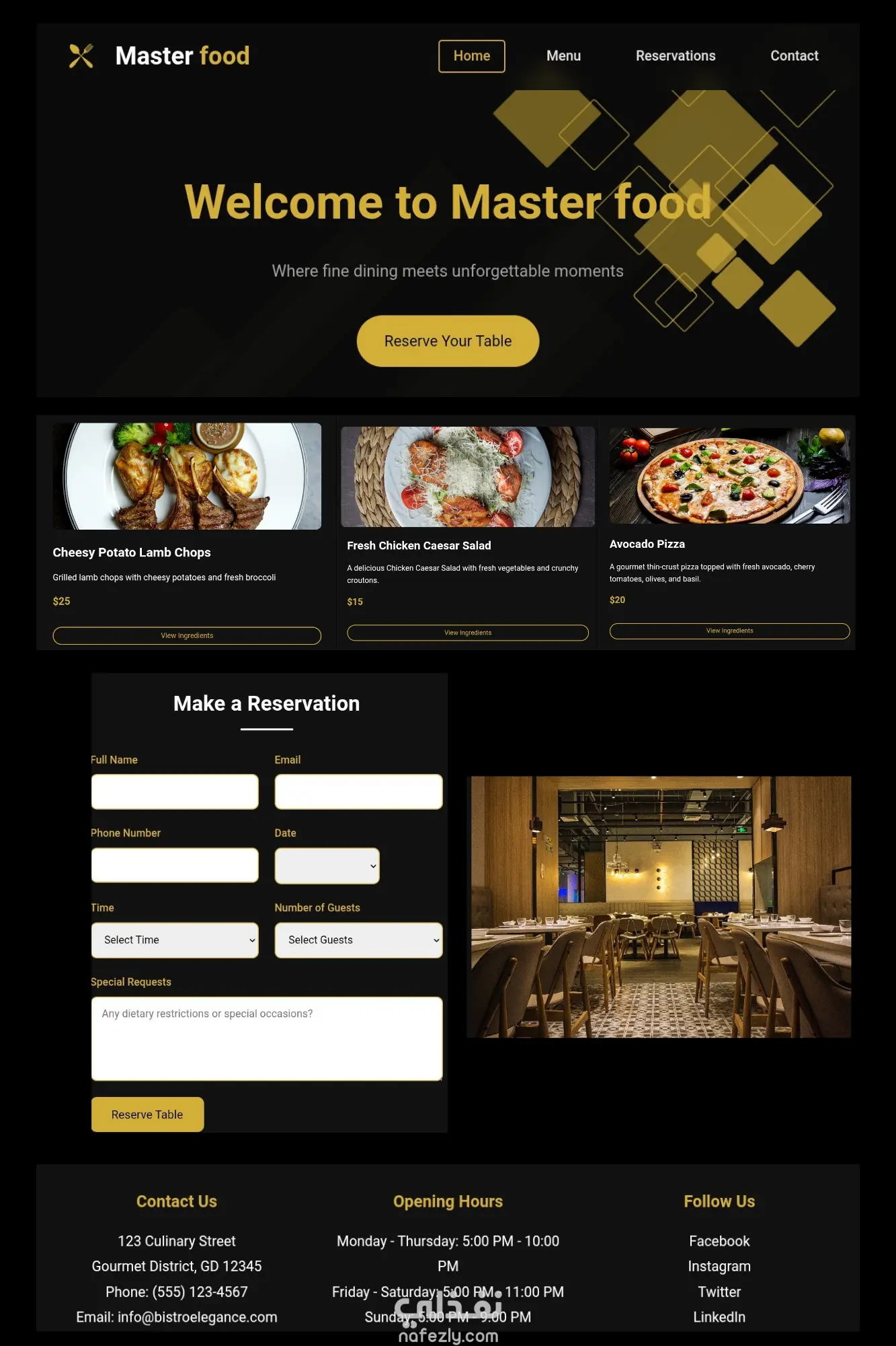 موقع ويب عصري مصمم خصيصاً للمطاعم الراقية، يجمع بين الأناقة البصرية والوظيفية العملية. تم اختيار الهوية البصرية بعناية لتعكس فخامة المكان وجودة الأطباق، مع توفير تجربة مستخدم سلسة تمكن الزائر من استكشاف القائمة والحجز في ثوانٍ. • الخدمات التي يعرضها: عرض القائمة الرقمية (Digital Menu): استعراض الأطباق مع تفاصيل المكونات والأسعار بشكل جذاب. نظام الحجز الفوري (Reservation System): واجهة مدمجة تسمح للعملاء بحجز طاولاتهم وتحديد عدد الضيوف والمتطلبات الخاصة. إدارة الهوية البصرية: توظيف الألوان الداكنة والذهبية لإعطاء انطباع بالفخامة والجودة العالية. • أقسام الموقع: قسم الاستقبال (Hero Section): يرحب بالزوار بعبارة جذابة وزر مباشر للحجز السريع. قائمة الأطباق المميزة (Featured Menu): استعراض لأهم الأطباق باستخدام بطاقات (Cards) ذات تصميم متناسق وخطوط واضحة. نموذج الحجز (Make a Reservation): نموذج تفاعلي منظم يسهل عملية جمع بيانات العملاء وتأكيد الحجوزات. معلومات التواصل (Contact & Footer): يتضمن الموقع خريطة الموقع، ساعات العمل، وروابط التواصل الاجتماعي لسهولة الوصول.