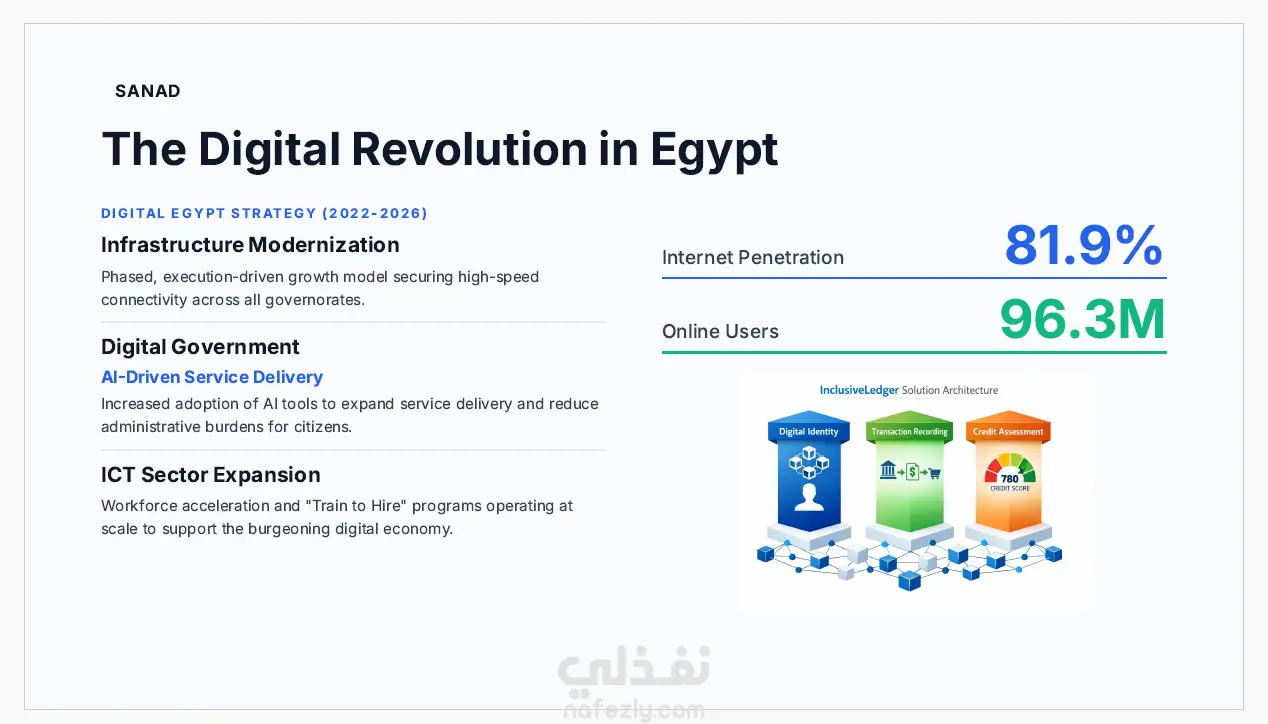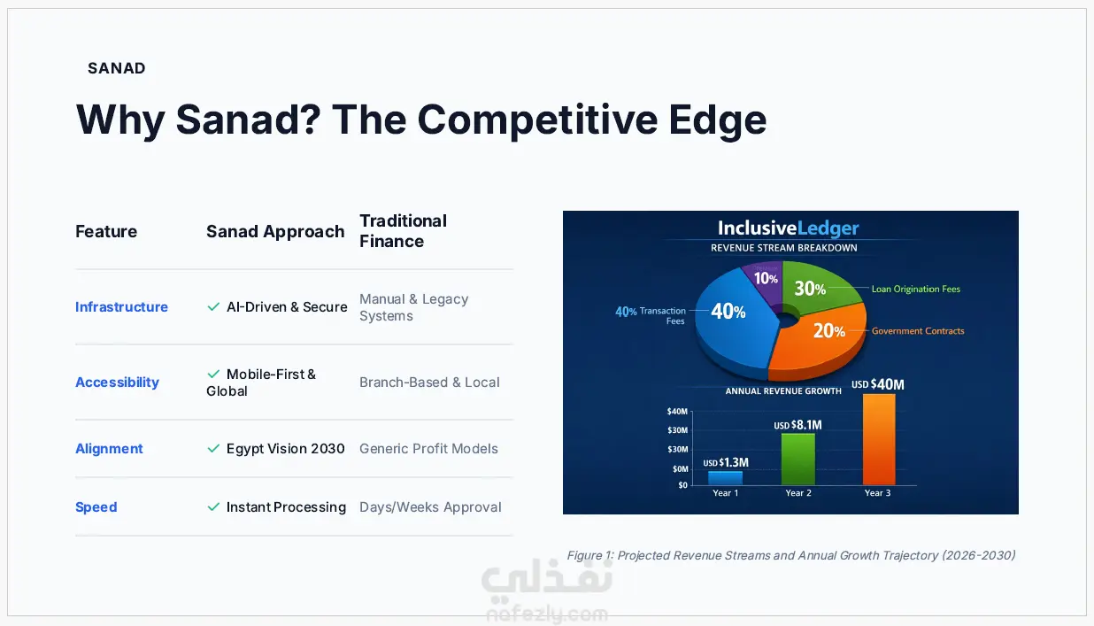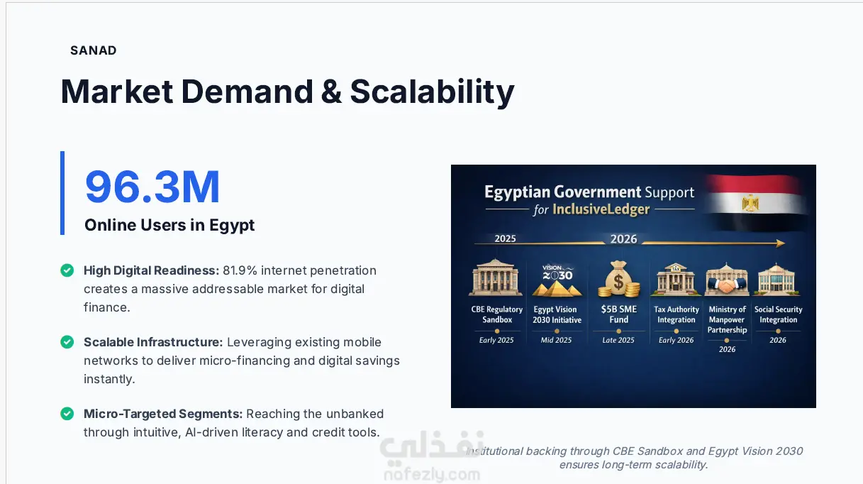 قمت بتصميم عرض تقديمي احترافي (Pitch Deck) لمشروع Sanad، وهو مشروع تقني يهدف إلى تعزيز الشمول المالي في مصر من خلال منصة رقمية تقدم خدمات التمويل الصغير والتثقيف المالي باستخدام التكنولوجيا الحديثة. يركز العرض على تقديم فكرة المشروع بشكل واضح ومقنع، ويتضمن: تحليل المشكلة في السوق المصري عرض الحل التقني المقترح دراسة حجم السوق والفرص المتاحة نموذج العمل ومصادر الإيرادات الميزة التنافسية للمشروع خارطة طريق للتوسع والنمو تم تصميم العرض بطريقة منظمة وبأسلوب بصري واضح ليكون مناسبًا لعرض الفكرة على المستثمرين أو الجهات الداعمة للشركات الناشئة.
