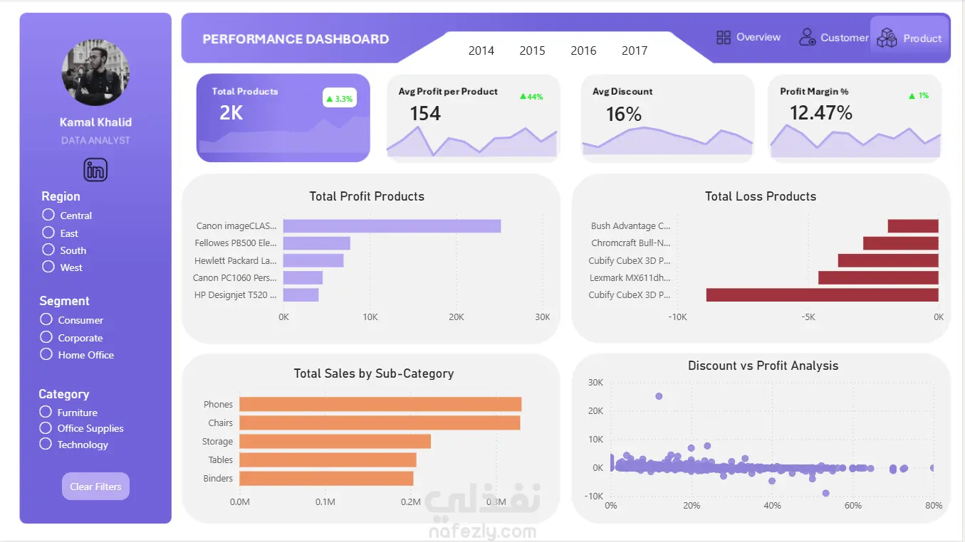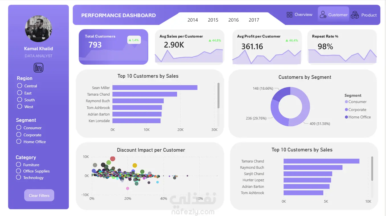 فكرة المشروع قمت بتصميم وتنفيذ Dashboard مبيعات متكامل باستخدام Power BI لتحليل بيانات شركة (Superstore)، بهدف تحويل البيانات إلى رؤى واضحة تساعد على فهم الأداء واتخاذ قرارات أفضل. ما الذي قمت بتنفيذه؟ تصميم Dashboard احترافي بواجهة حديثة وسهلة الاستخدام إنشاء مؤشرات أداء رئيسية (KPIs) مثل: - Total Sales - Total Orders - Total Profit - Average Order Value بناء نظام فلاتر تفاعلي يشمل: - Region - Segment - Category التحليلات التي تم تنفيذها: - تحليل اتجاه المبيعات عبر الزمن (Sales Trend) - مقارنة المبيعات بالأرباح (Sales vs Profit) - تحليل تأثير الخصومات على الأرباح (Discount vs Profit) - تحديد المنتجات الأكثر ربحًا والأكثر خسارة - تحليل أفضل العملاء (Top Customers) - توزيع المبيعات والعملاء حسب الفئات الهدف من المشروع تحويل البيانات الخام إلى Dashboard تفاعلي يساعد على: - متابعة الأداء بشكل لحظي - اكتشاف الاتجاهات والأنماط - دعم اتخاذ القرار بناءً على بيانات دقيقة الأدوات المستخدمة - Power BI - Data Modeling - DAX - Data Visualization