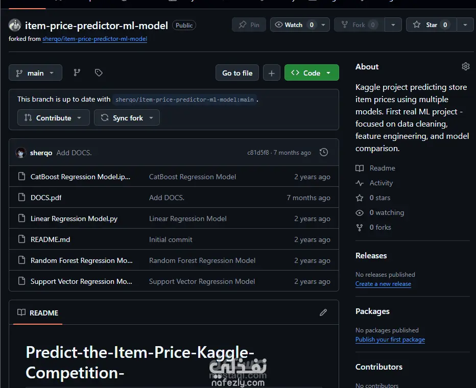Project Description Item Price Prediction – Machine Learning Model This project focuses on predicting store item prices using machine learning techniques. The goal of the project is to build and compare different regression models in order to find the most accurate model for price prediction. The project was developed using a dataset from a Kaggle competition related to item price prediction. The workflow includes several important steps in a typical data science pipeline such as data preprocessing, feature engineering, model training, and model evaluation. Several regression algorithms were implemented and compared, including: Linear Regression Random Forest Regression Support Vector Regression (SVR) CatBoost Regression The dataset was first cleaned and prepared by handling missing values and selecting the most relevant features. After preprocessing, different machine learning models were trained and evaluated to compare their performance and determine the best predictive model. This project demonstrates practical experience with machine learning workflows, model comparison, and predictive analytics using Python. Technologies used: Python Pandas NumPy Scikit-learn CatBoost