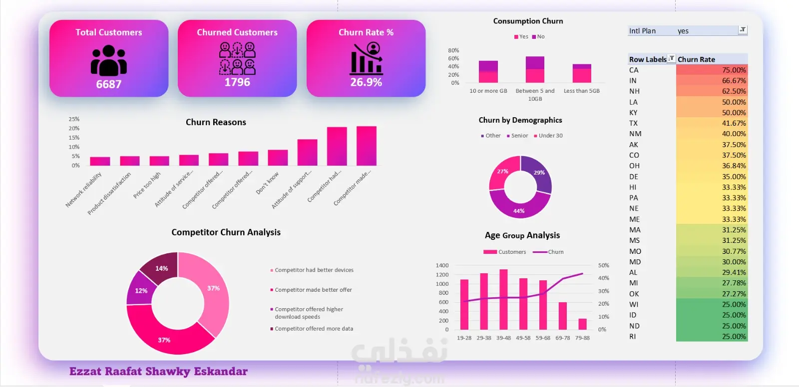 مؤشرات الأداء الرئيسية (KPIs): عرض فوري لمعدل الفقد (Churn Rate)، إجمالي العملاء المغادرين، والخسائر المالية المترتبة على ذلك.