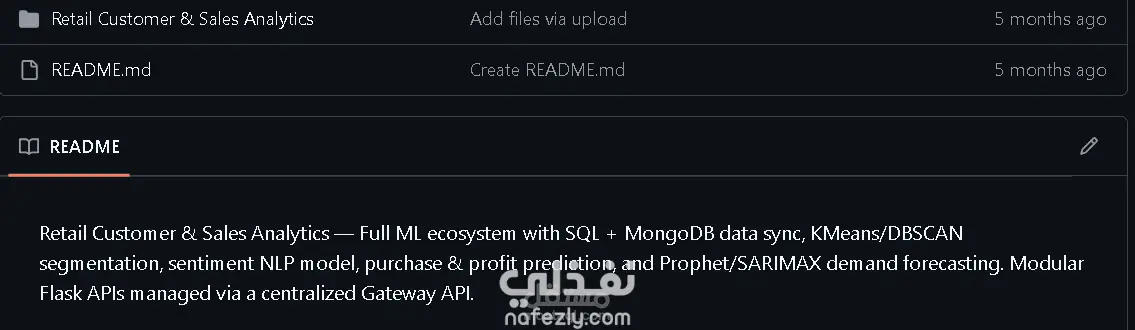 قمت بتطوير نظام متكامل لتحليل بيانات العملاء والمبيعات في قطاع التجزئة باستخدام تقنيات تعلم الآلة (Machine Learning)، بهدف مساعدة الشركات على فهم سلوك العملاء وتحسين قرارات المبيعات والتسويق. يعتمد النظام على بنية متكاملة لمعالجة البيانات وتحليلها، حيث يتم مزامنة البيانات بين قواعد بيانات SQL و MongoDB لضمان إدارة مرنة وفعالة للبيانات. يتضمن النظام عدة نماذج وتحليلات متقدمة، منها: تقسيم العملاء (Customer Segmentation) باستخدام خوارزميات K-Means و DBSCAN لتحديد أنماط وسلوكيات العملاء المختلفة. تحليل المشاعر (Sentiment Analysis) باستخدام نموذج معالجة لغة طبيعية (NLP) لتحليل آراء وتعليقات العملاء. التنبؤ بالمشتريات والأرباح باستخدام نماذج تعلم الآلة لتوقع سلوك الشراء المستقبلي. التنبؤ بالطلب على المنتجات باستخدام نماذج السلاسل الزمنية مثل Prophet و SARIMAX لتحسين التخطيط للمخزون والمبيعات. كما تم تصميم النظام بطريقة Modular Architecture باستخدام Flask APIs، ويتم إدارة جميع الخدمات من خلال Gateway API مركزي لتسهيل التكامل مع التطبيقات الأخرى ولوحات التحكم. يساعد هذا النظام الشركات على تحليل بيانات العملاء بذكاء، تحسين استراتيجيات التسويق، وزيادة الأرباح من خلال التنبؤ الدقيق بالطلب والمبيعات.